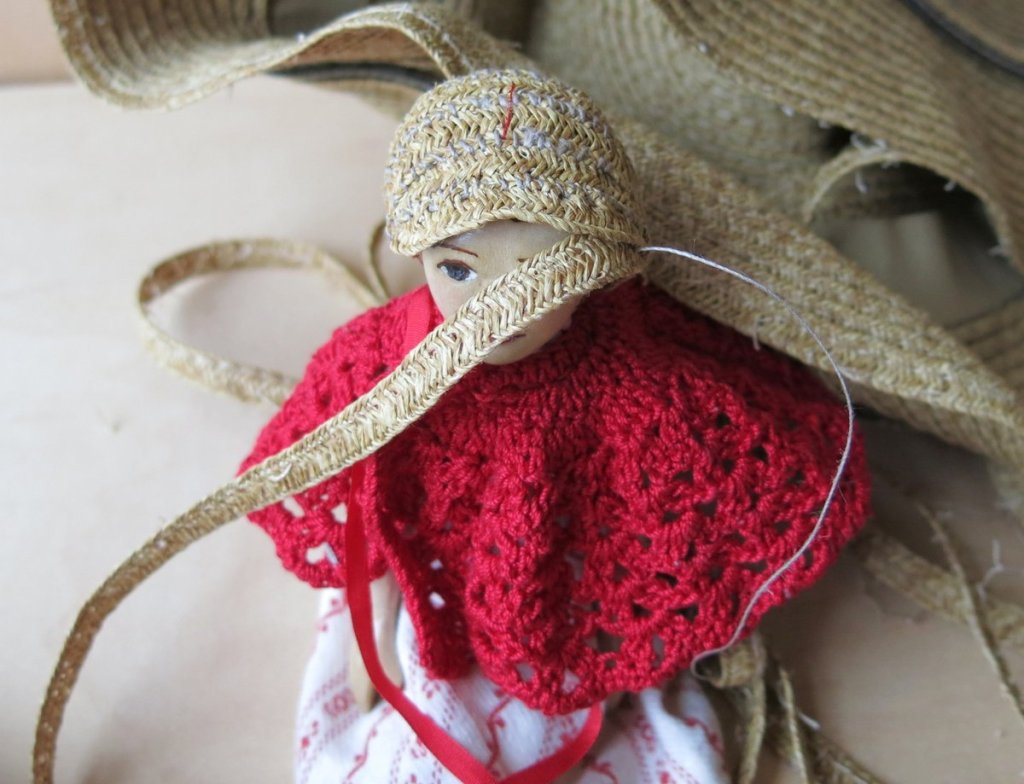 To get the shape I wanted, I have made a few slight gathers at the sides of the brim on the penultimate row of the braid. You can also see the red basting thread I put in to keep track of the centre of the bonnet.