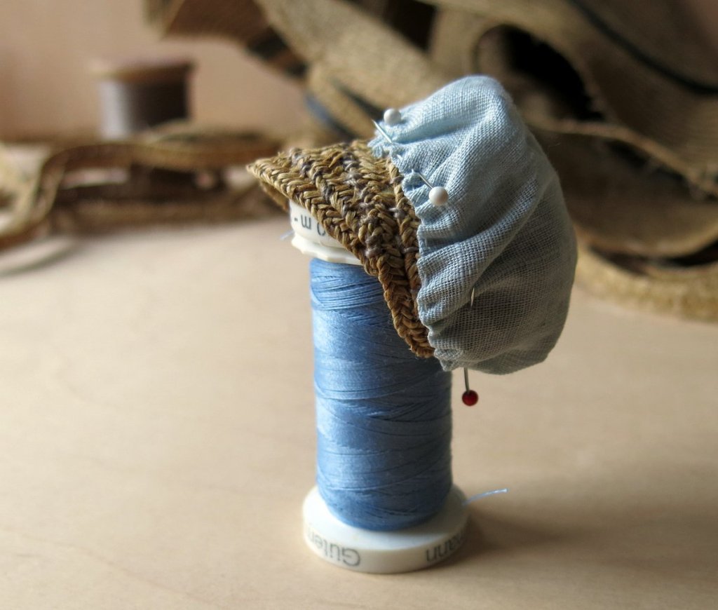 Pin and stitch the cloth over the straw hat crown, leaving the brim exposed.