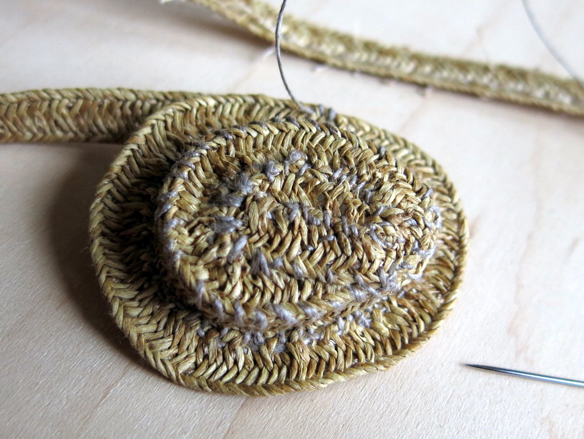 The Human straw hat disassembly/Hitty-hat millinery project continues.  I had a couple of girls interested in Straw Boaters, so I started with an oval crown…