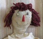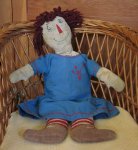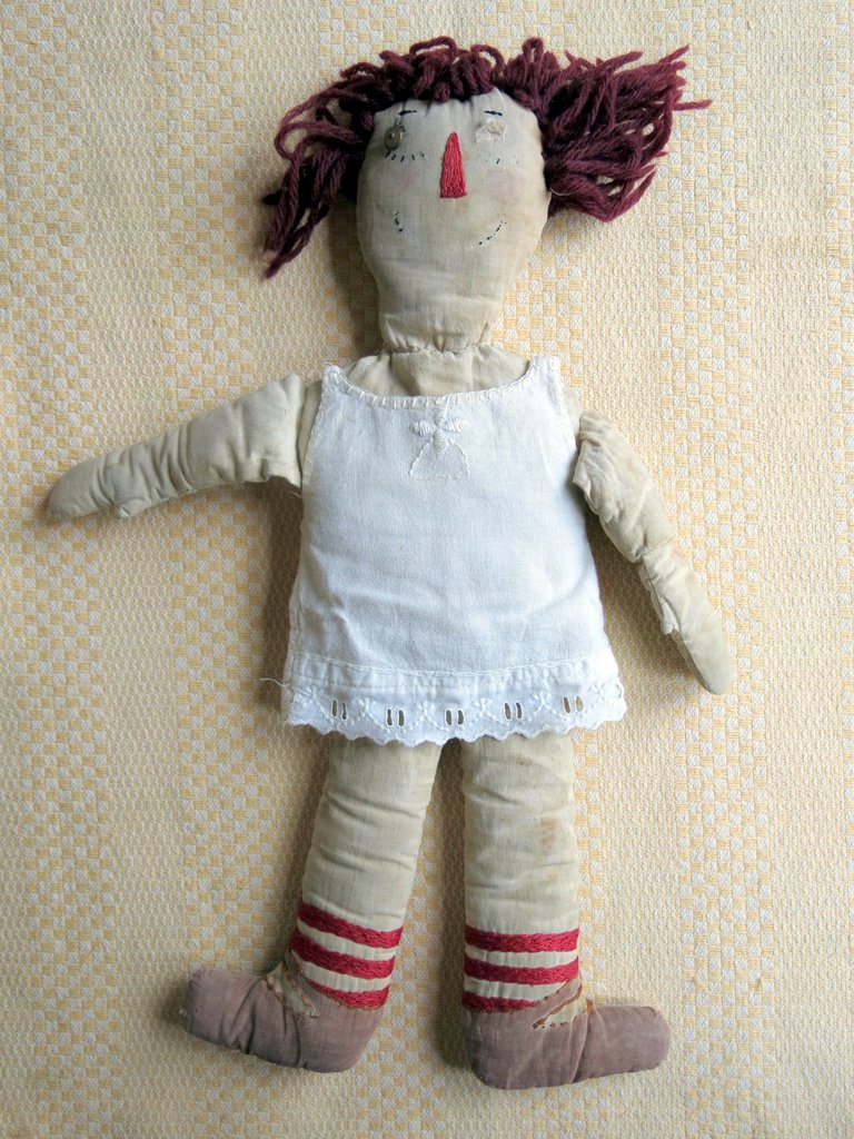 I am sure that sometimes a beloved old doll has a story, but you just don’t know what it is. Luckily for me this Raggedy Ann belonged to a friend who told me all about her. Eva was born in Norway, and immigrated to the United States in the 1920’s as a little girl.  One of her cousins, a slightly older little girl made and dressed this doll for her as a welcome present.