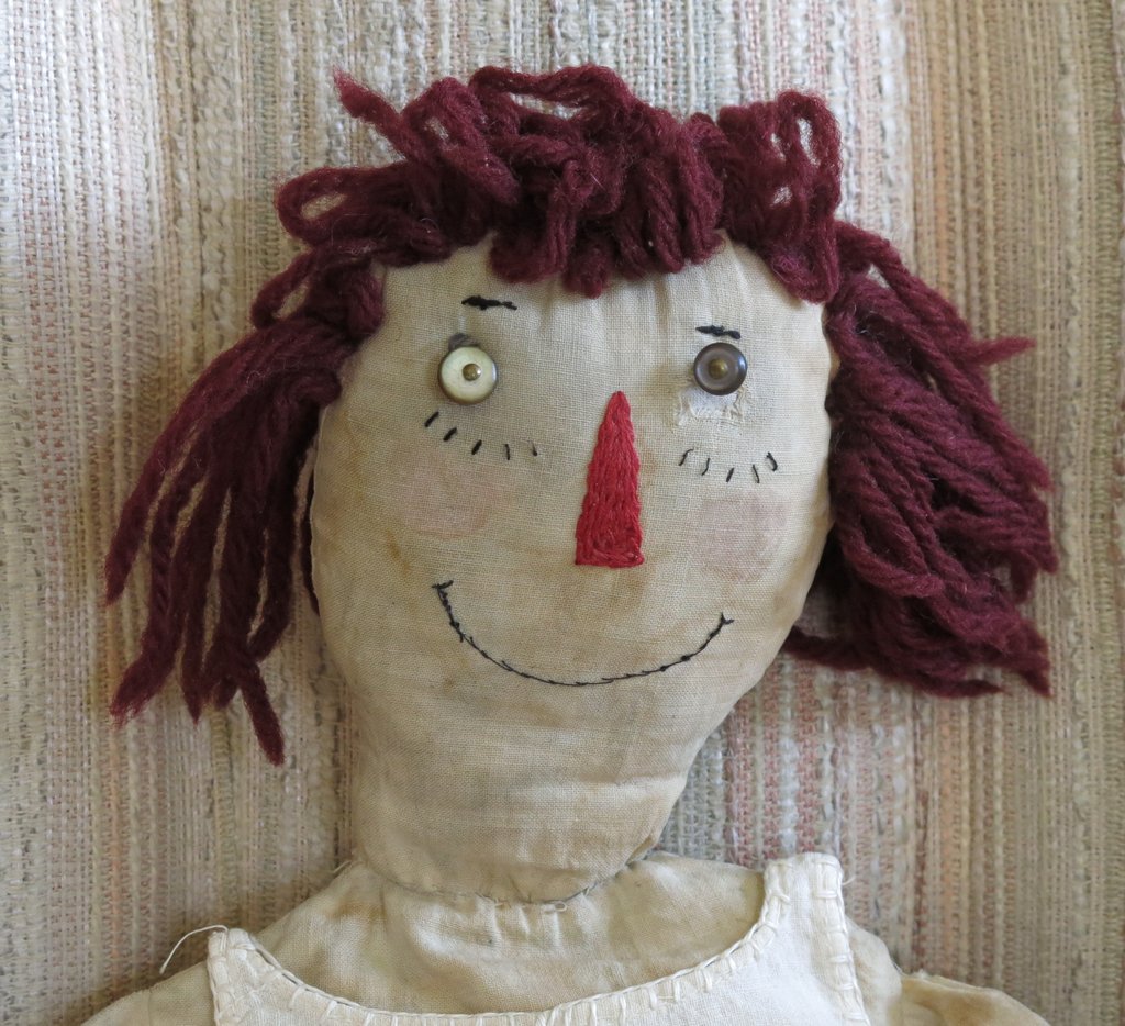 Binocular vision at last! The shoe-button eye was sewn down into the place indicated by a remnant of rust on the original face. If you think the eyes are little uneven, you are right, don’t forget this was made by a child!