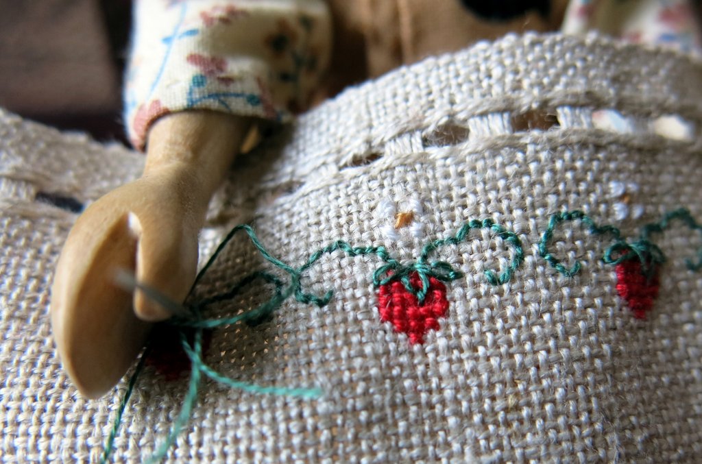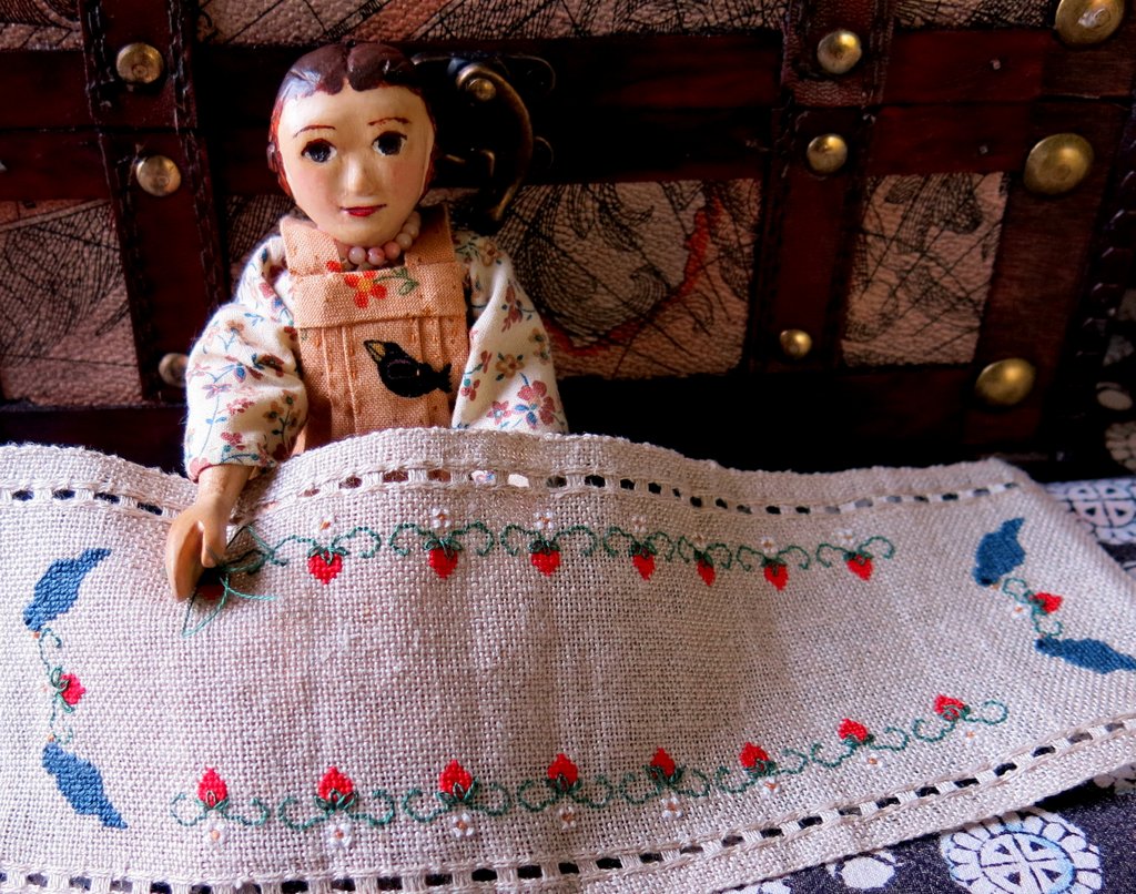 Constance dreams of berries even without embroidered pillows. The needle roll looks like a useful object – it is the first one I ever made, but I will enjoy using it!