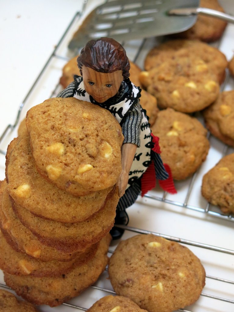 …she enthusiastically stacked the white chocolate chip cookies with toasted pecans and dried apricots…