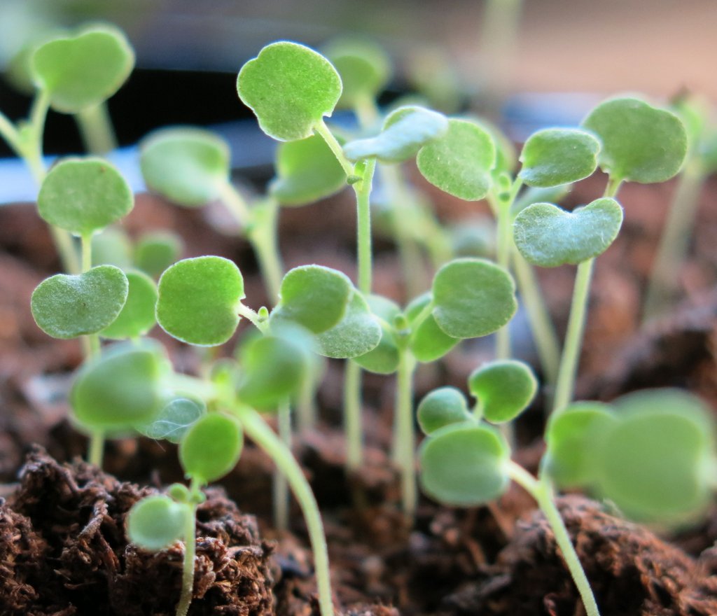 This week the wee plants have doubled in size, are getting their second pair of true leaves, and starting to look spindly.