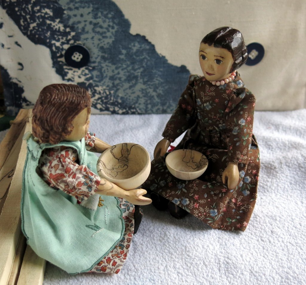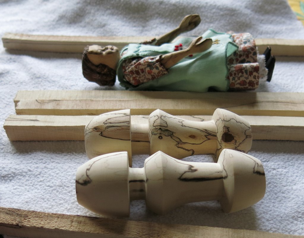 The Quimper Hitty human has a very good friend who appeared to be immune to Hittys. However, another friend of that friend acquired a new lathe, and was looking for projects. I gave my friend, and she gave her other friend an approximate profile of an uncarved Hitty blank, and a couple of weeks later a basket of goodies arrived at the Hitty cupboard.