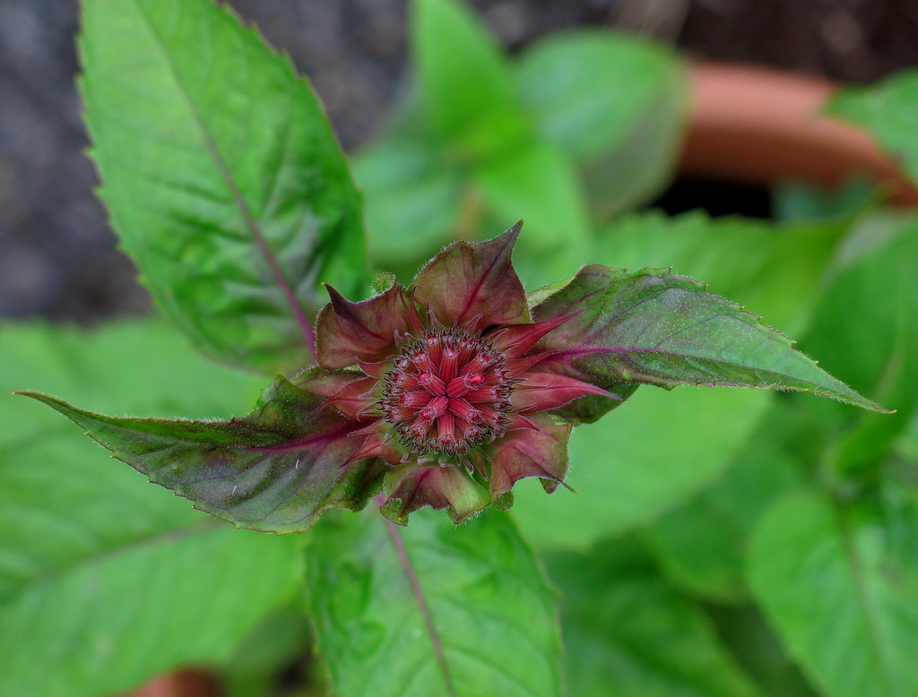 In just one day, and despite the inclement weather, the sepals protecting the flower buds have folded back completely to reveal the inflorescence of Min’s bee balm…