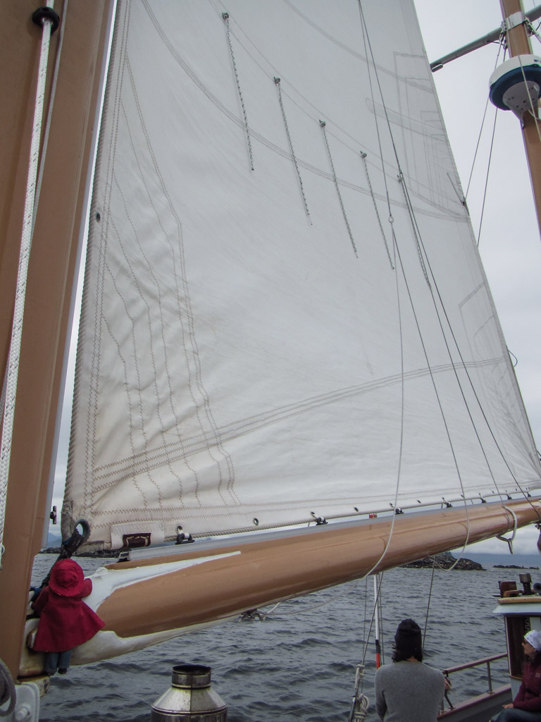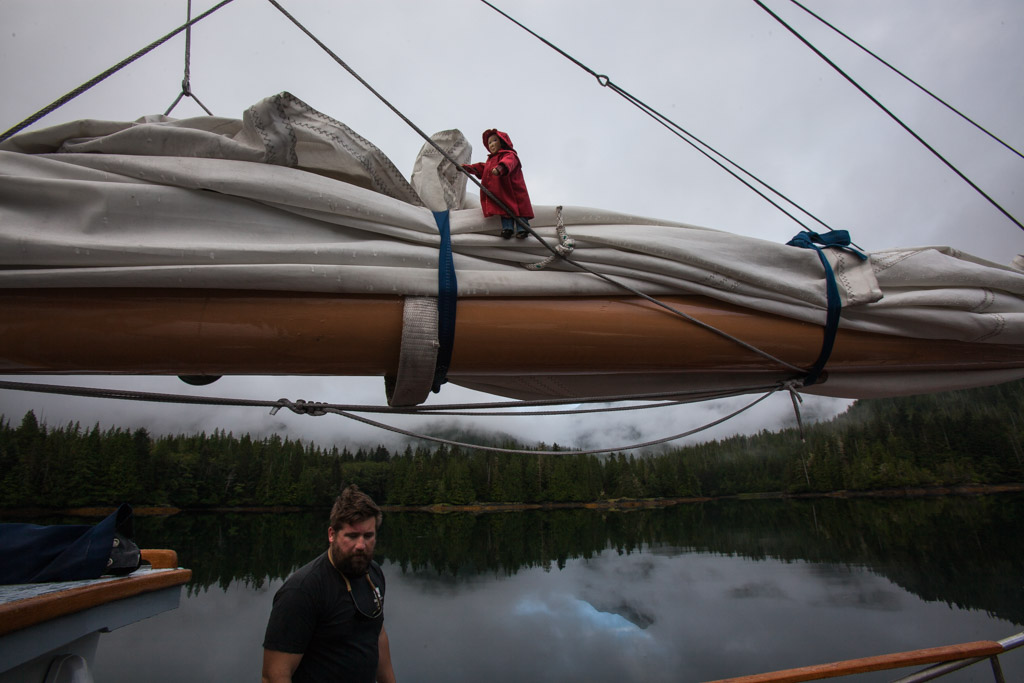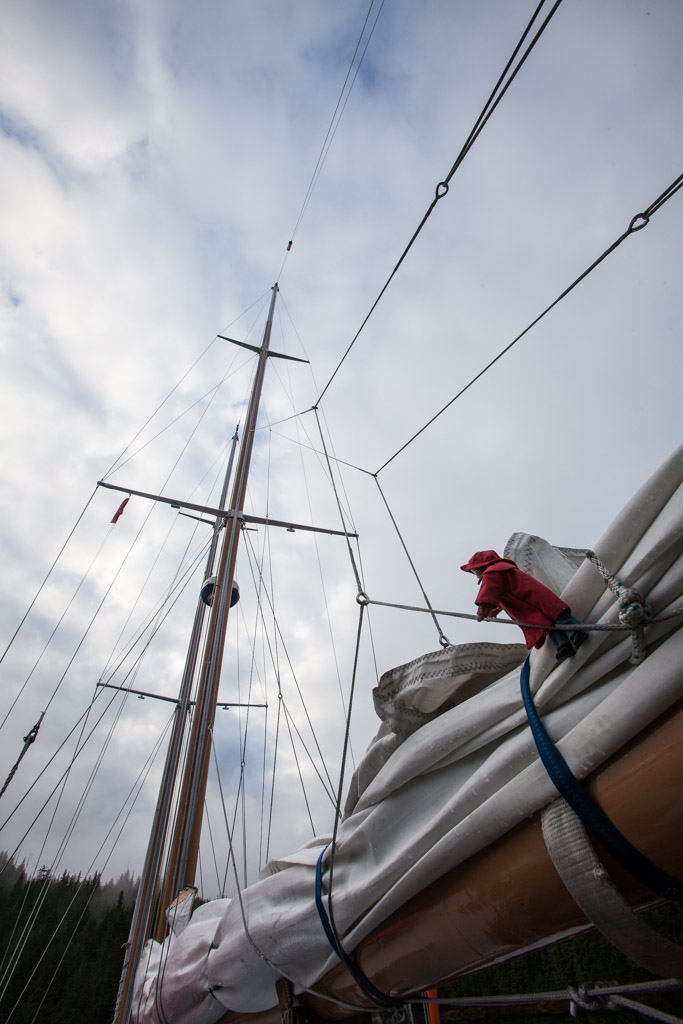 At the end of the day Tansy would inspect the furled sails to make sure nothing would come astray in the evening. This includes an inspection of the Lazy Jacks to make sure they are ready to guide the sails up and, more importantly, down during the next day of sailing.