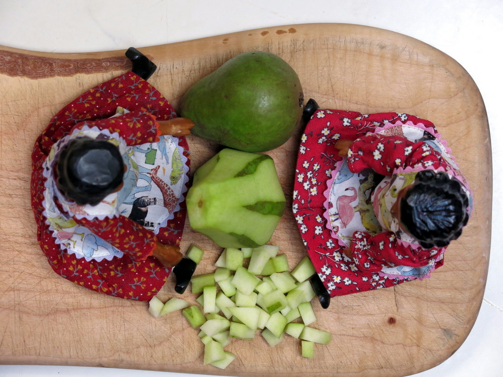 The pears are still too small and unripe for eating, but it is a good excuse to try and replicate some heavenly jam that our friend the Dollhouse Lady gave us a couple of years ago. If you tried to make jam with ripe pears it would turn into gritty mush.