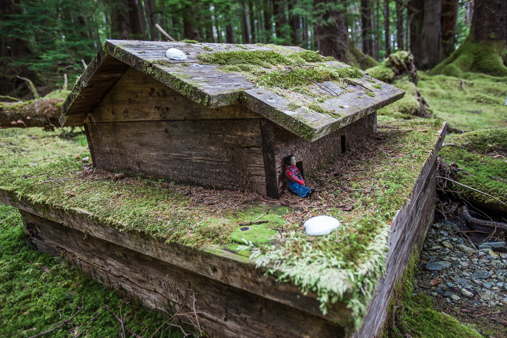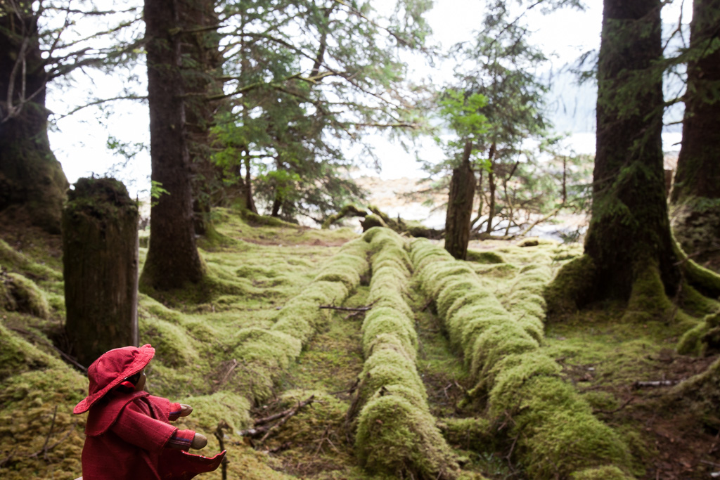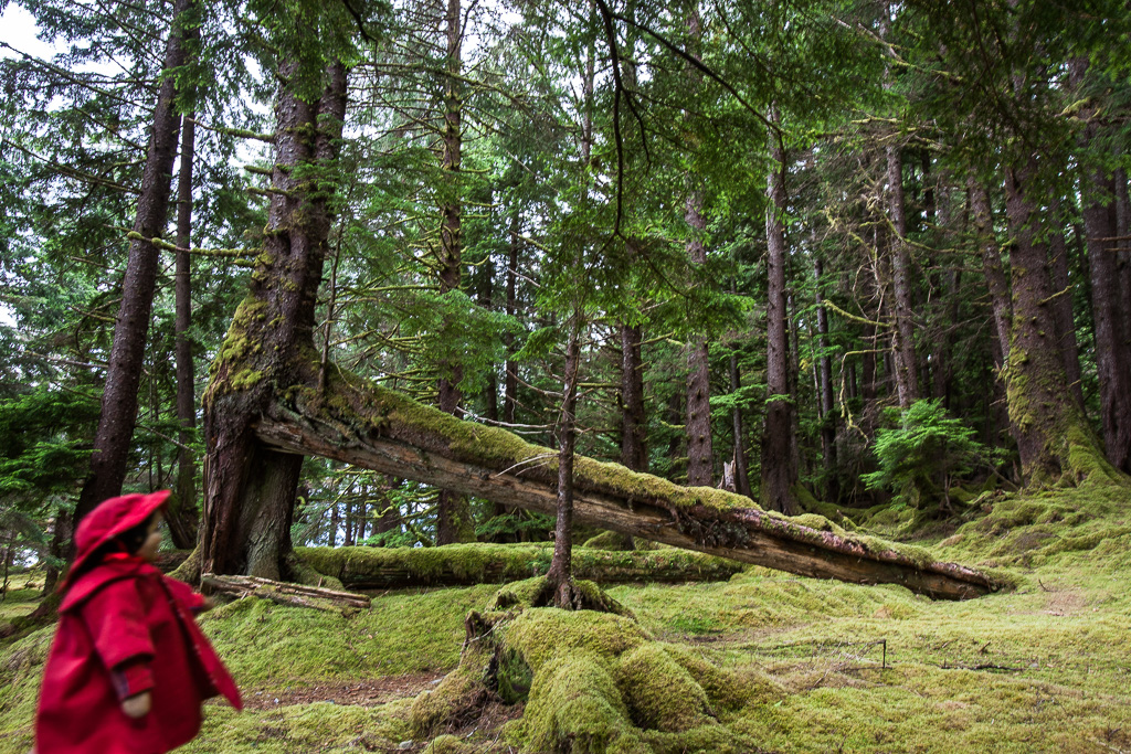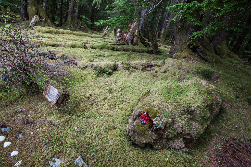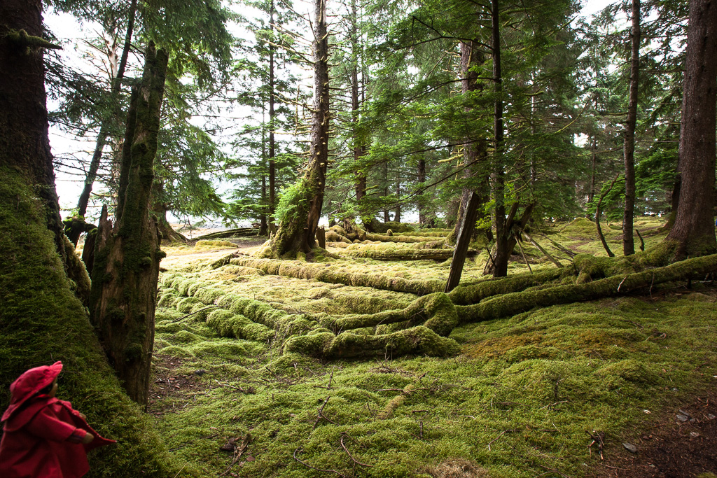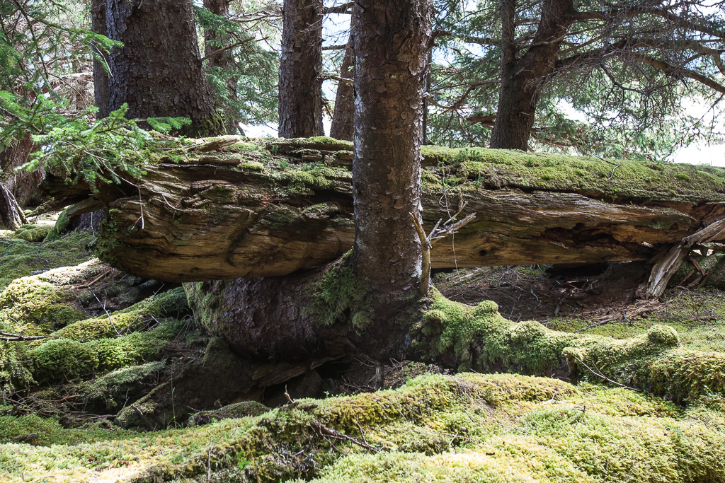 T’aanuu is one of three old Haida village sites Tansy visited that still has visible architectural features. Here is an old house where a spruce tree has grown into the top of a corner post.  One section of root has grown straight down and nearly encased the upright post, part of which has fallen on top of the moss. Another root of the same tree has traveled diagonally along the fallen beam until it reached the earth.
