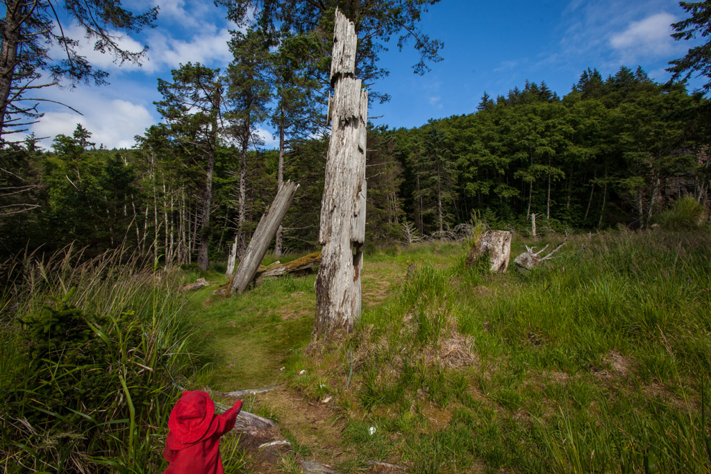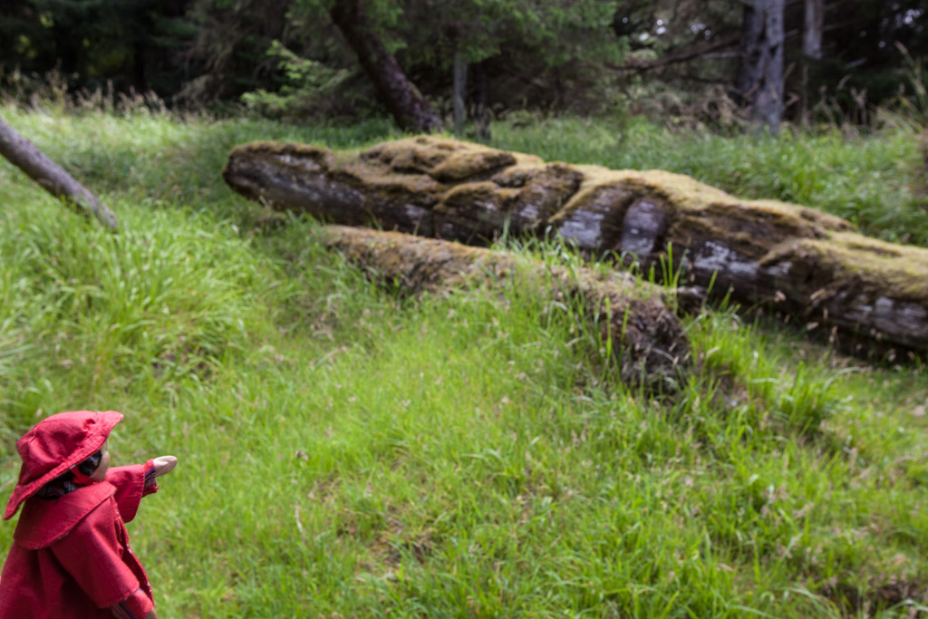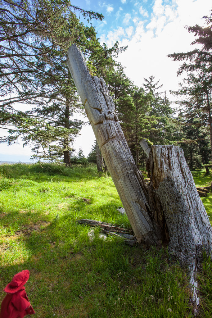Tansy enjoyed being able to walk along the moss on this pole and observe the carving more closely. She has an expert appreciation for carving and is grateful to be so small that she can walk in places the heavy humans are not allowed. She could hear, very faintly, the pole singing potlatch songs as she examined it.