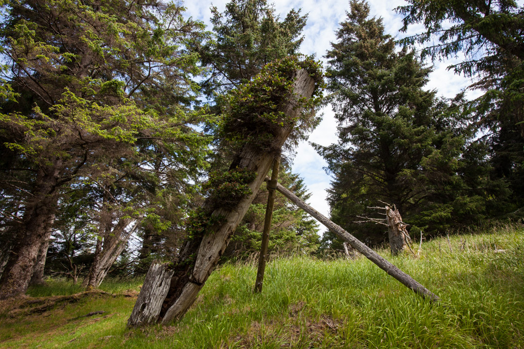 17Tansy_at_Skedans (11)K’uuna has a good variety of poles of different types and house features. It is located outside of Gwaii Haanas but is still within the Haida Heritage Site protected area and as with the other Haida villages we were greeted and guided by a Haida Watchman.