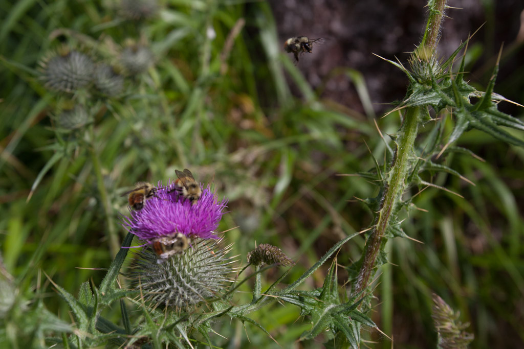 There was a small patch of thistles, introduced sometime in the distant past and Tansy stopped to watch the bumble bees hard at work.