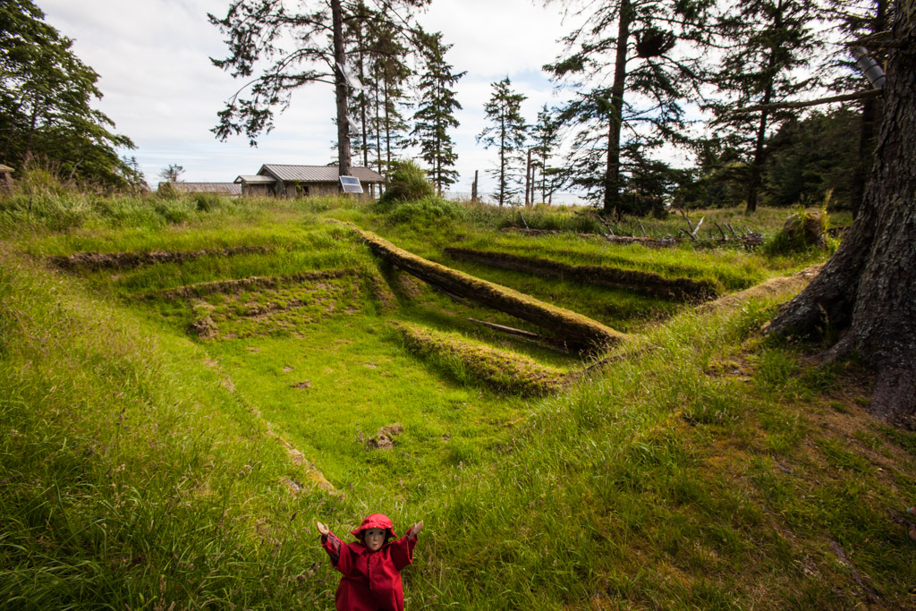 In the top picture Tansy is excited to see such a deep house feature. In Haida tradition a house pit has to be dug in one day. The bigger and deeper the pit obviously the greater the resources a chief could organize to get the job done, and thus the more powerful and higher his status.