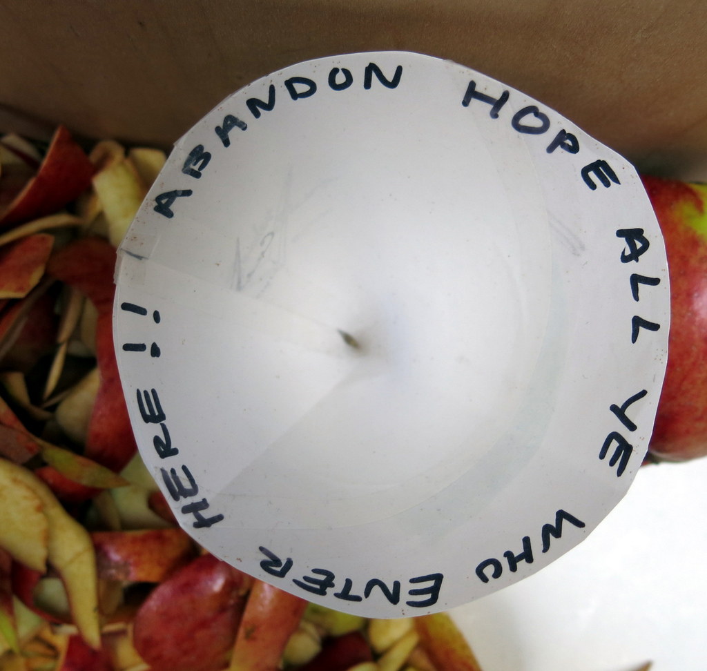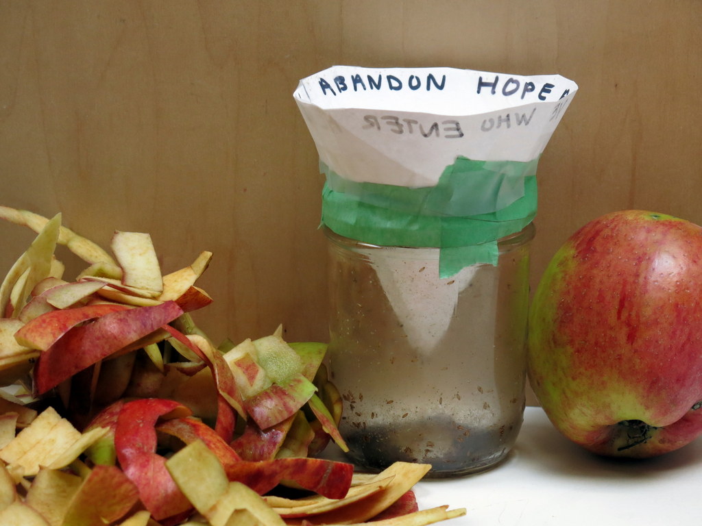 …about our infallible trap, (a jar with the bait at the bottom of the jar, and a paper cone taped to the rim with a small hole at the bottom of the cone).