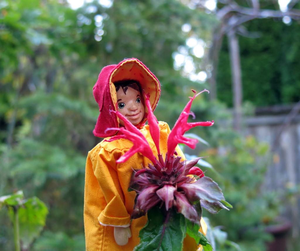 Min’s bee balm reminds me of the little golden book “The little red hen”. Min worked so hard at caring for that little plant. Her patience paid off. Her sweet little rain coat, hat and smile made my day.