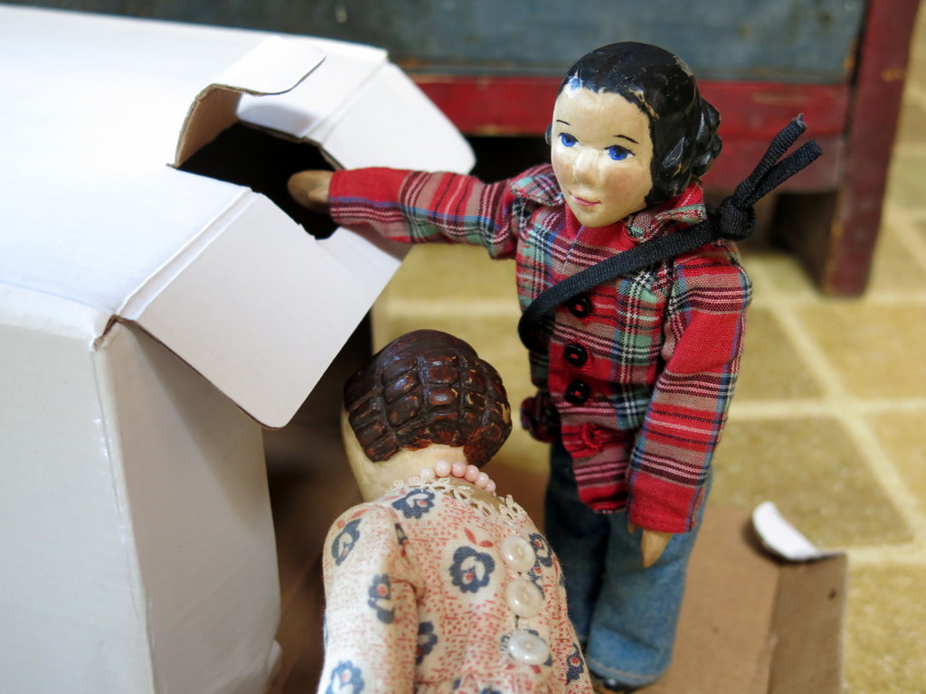 • That little girl came home with us from Oregon, and was a gift from one of the other carvers. I think her name is Buttercup, but though she is the same height as Min, she is a little broader in the beam so she could only borrow this one dress.