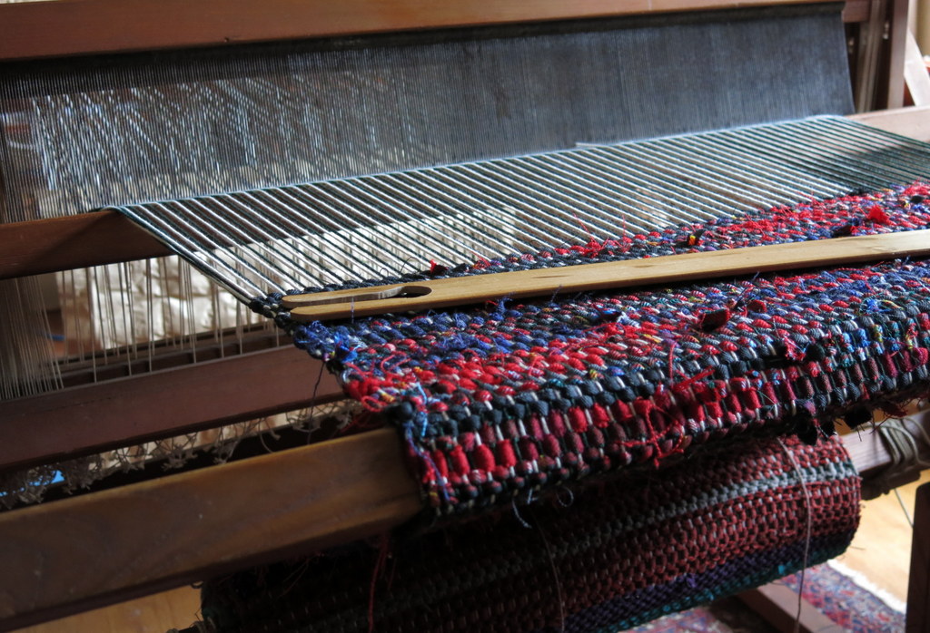 Several obstacles had to be overcome, including fixing the brake pedal, and installing a new brake line, before I even started to weave. After I got going I realised that one of the uprights holding the reed was cracked, and it broke during the middle of beating the first rag rug! Thankfully our favourite photographer dug into his woodpile and fashioned a new one just like that, I didn’t even have to take the warp off!