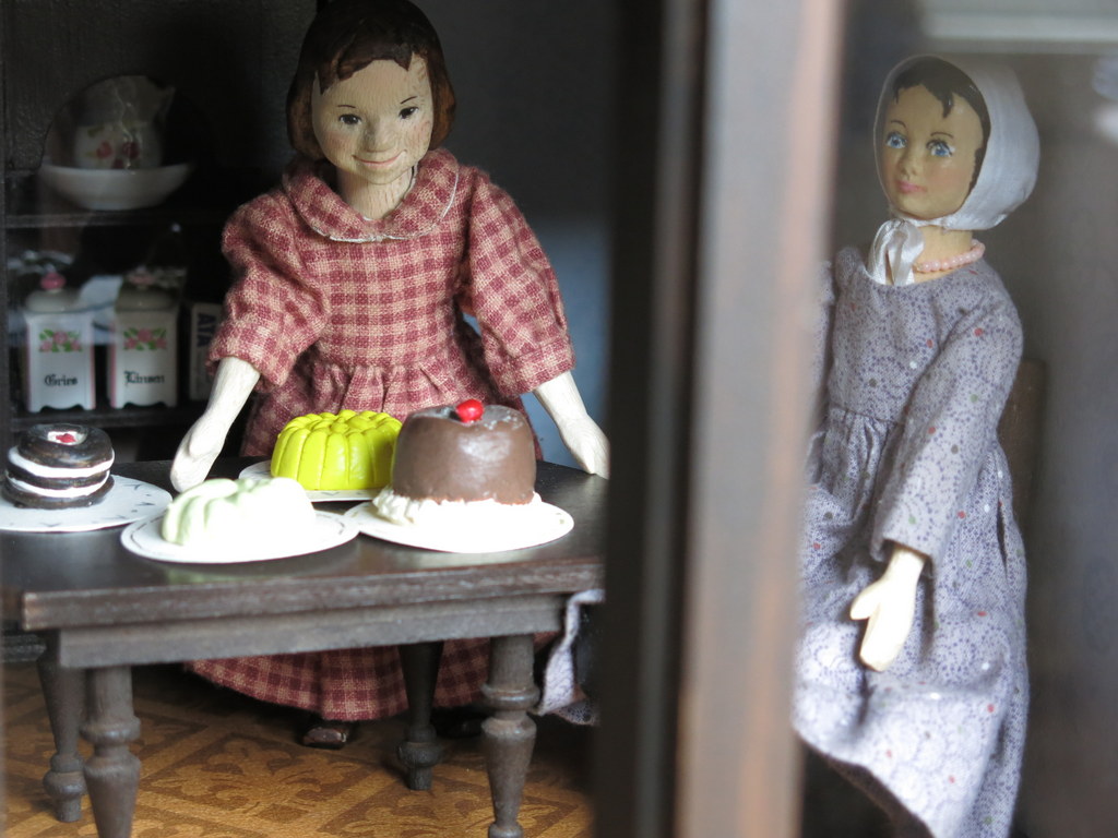 The house was empty of inhabitants…though when she and Amelia explored a little, they found a number of delightful looking cakes and puddings. Amelia was very tempted to stick her finger into the crème and have a little taste, but Mary Ann felt a little overwhelmed!