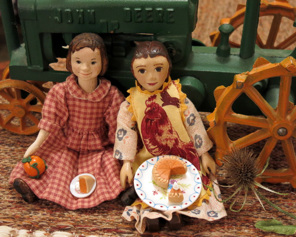 The days are getting shorter, the nights cooler and darker…it is a good time to share delicious food with friends, and to tell them how much they mean to us. Constance (my first Hitty, carved in 2007) has many tales to tell! Amelia (my latest doll, carved this year) is hoping she might some day have lots of adventures too, but for now is happy to listen to them, and to help eat up the pie.