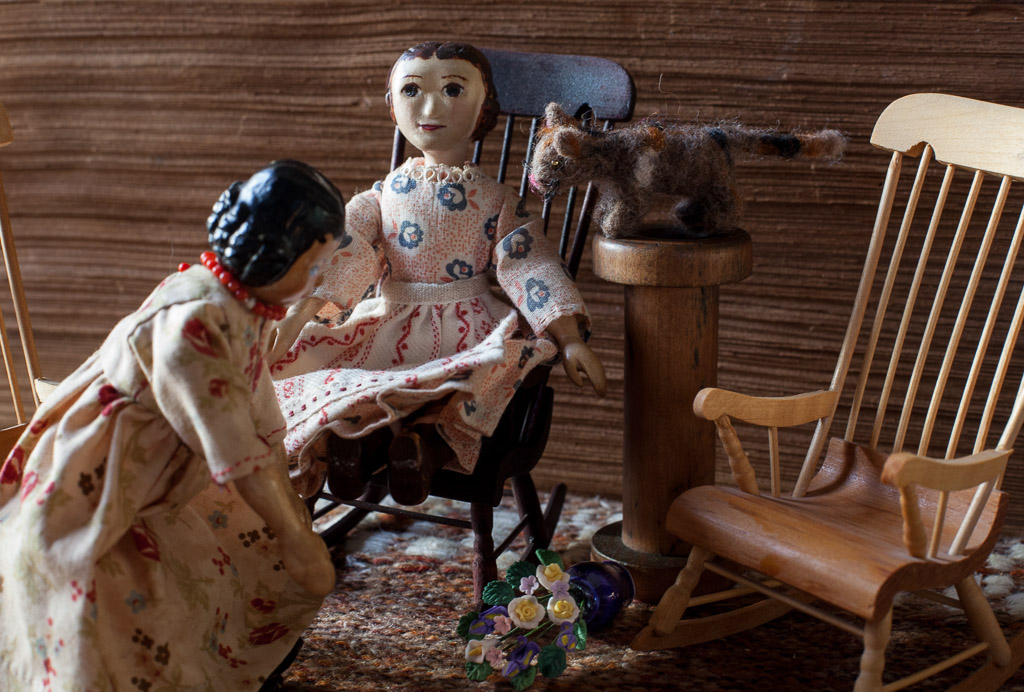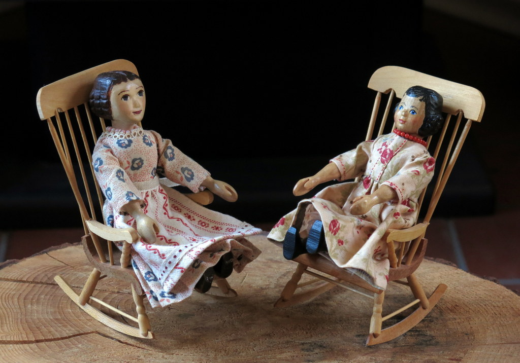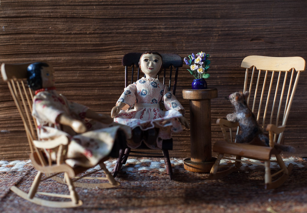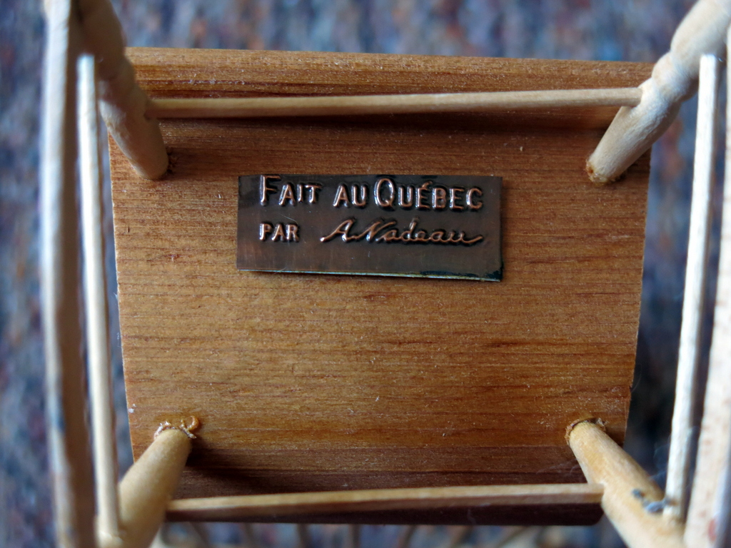 Our friend the Dollhouse Lady gave us a really beautiful dark-stained rocking chair made in Quebec by artisan Albert Nadeau. To the complete and utter amazement of the Quimper Hitty’s human, we found two more chairs by the same artist in a consignment store.
