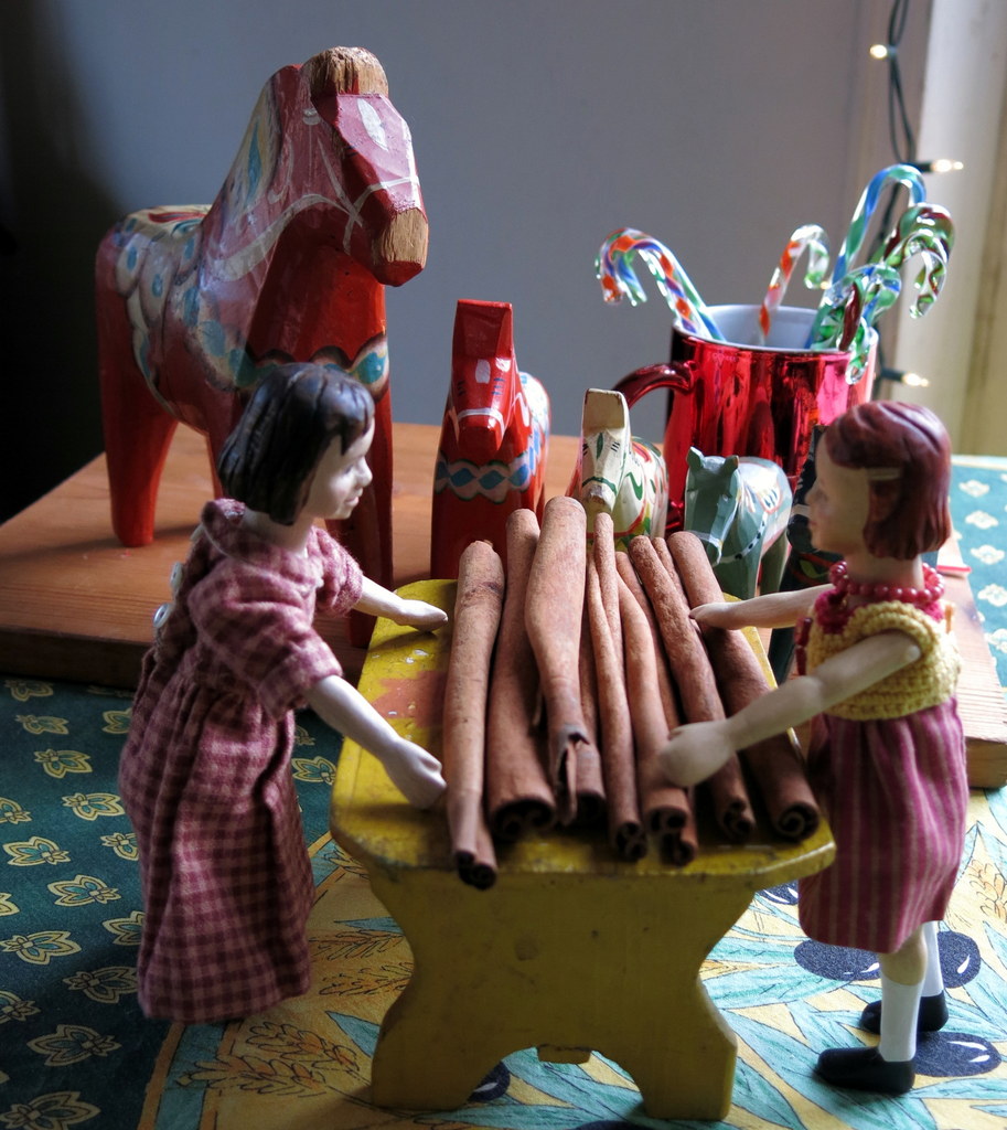 I think I’ll call Aurelia and Amelia “The Dynamic Duo “. They could teach Martha Stewart a few new tricks. That photo of them cutting cinnamon sticks with the saw using a miter box was the limit. Their finished Christmas hanging was beautiful.