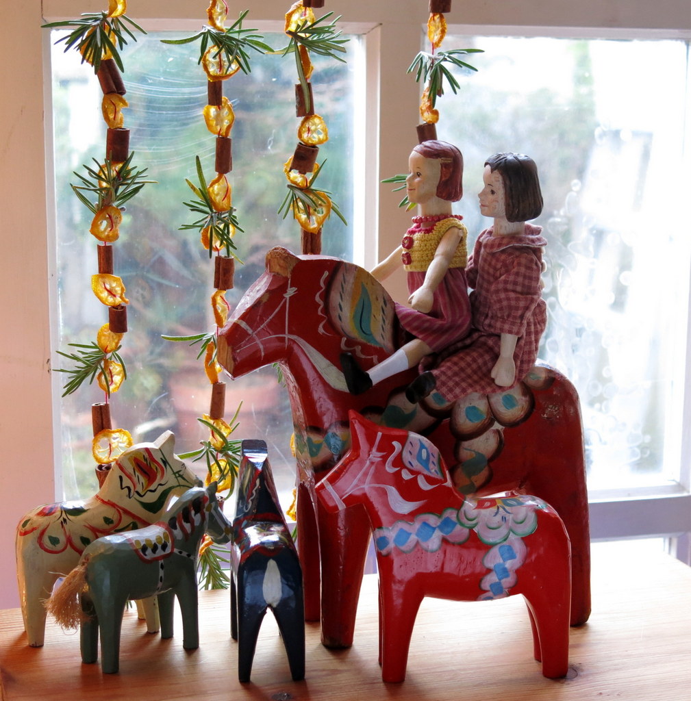 Five Dalahäster gazed upon nine kumquat pomanders…it sure takes a lot of cloves to make these, and they wondered what ever happened to the rest of the kumquats when the cloves ran out???