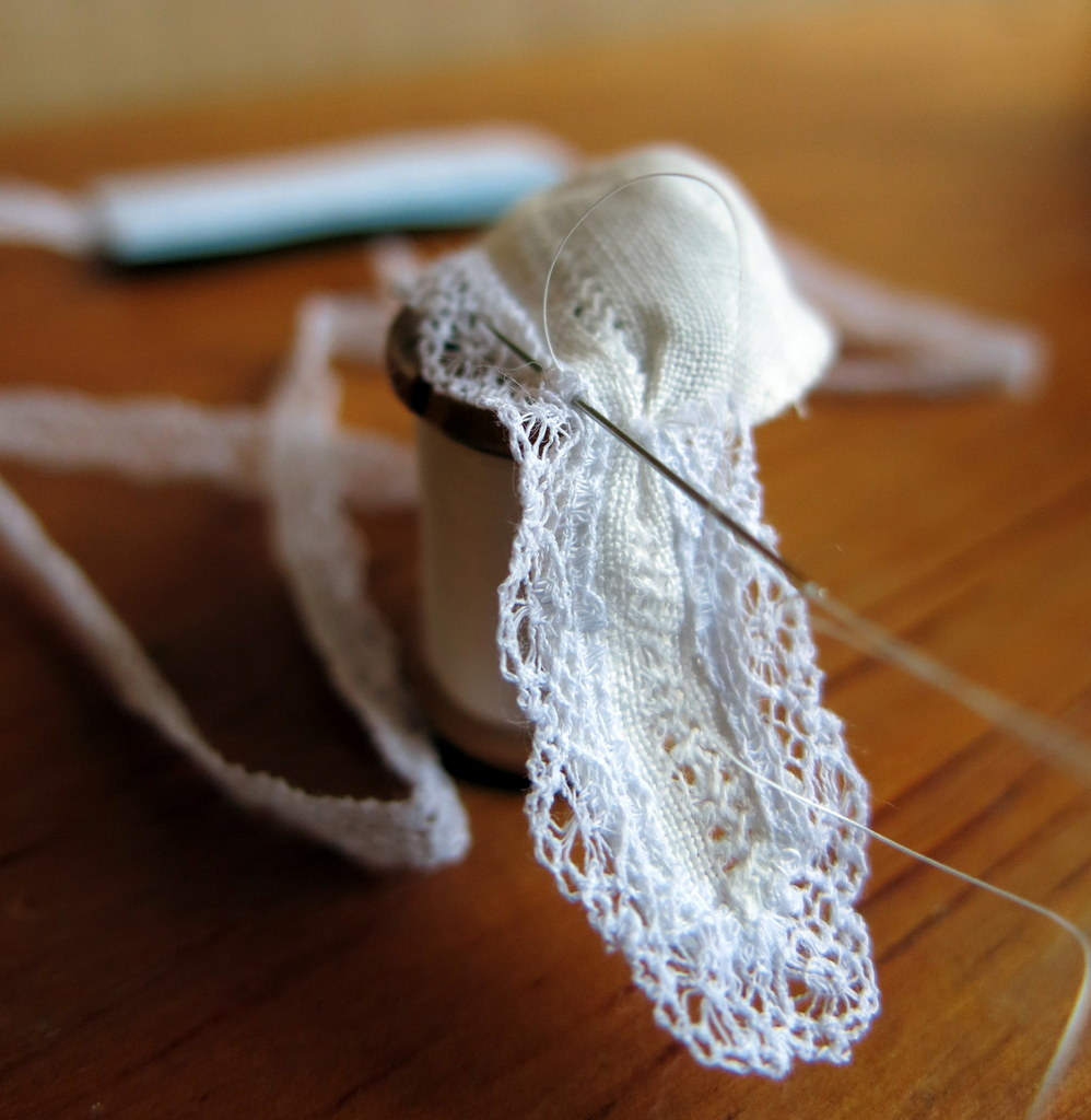 Stitch flat lace all round all edges – gathering at the bottom of the lappets so the lace lies flat around the curve. Make small tucks or folds at the back corners.