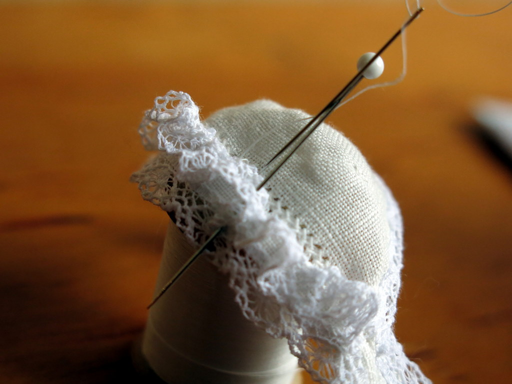 Second row of lace, double the length of the front edge, gathered and stitched to that edge.