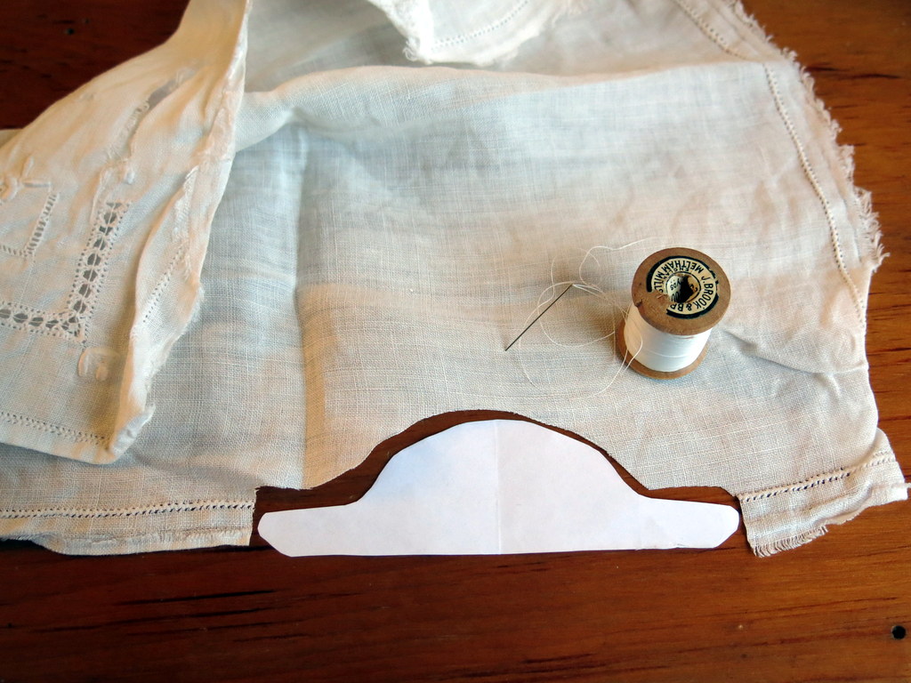 Cut a “half-circle with ears”. I positioned my pattern to take advantage of a nice bit of hemstitching.