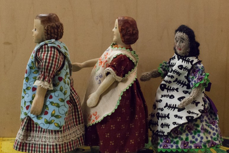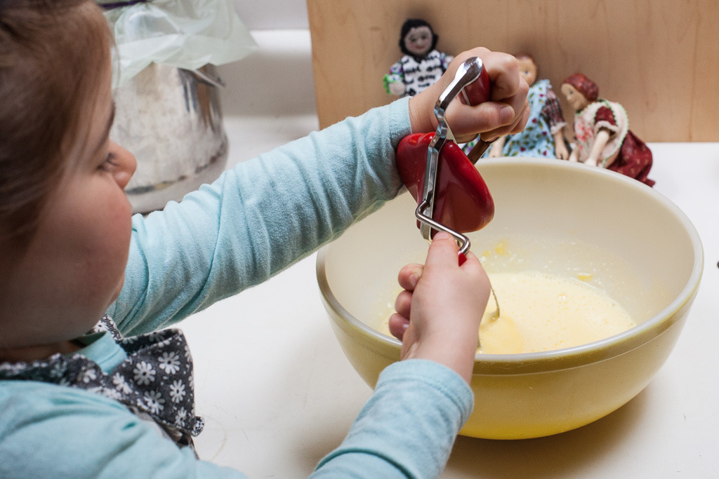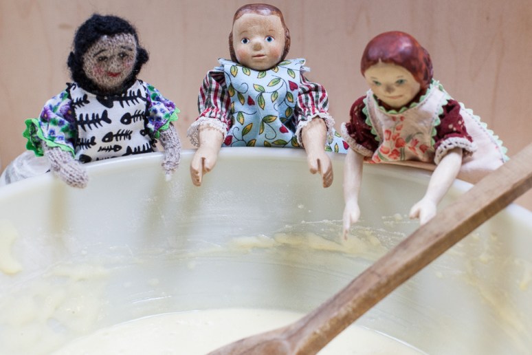 The Queen of Flowers invited Dulcie, Hattie and Lala to help make cake…the queen chose their aprons, and the girls all helped each other put them on!