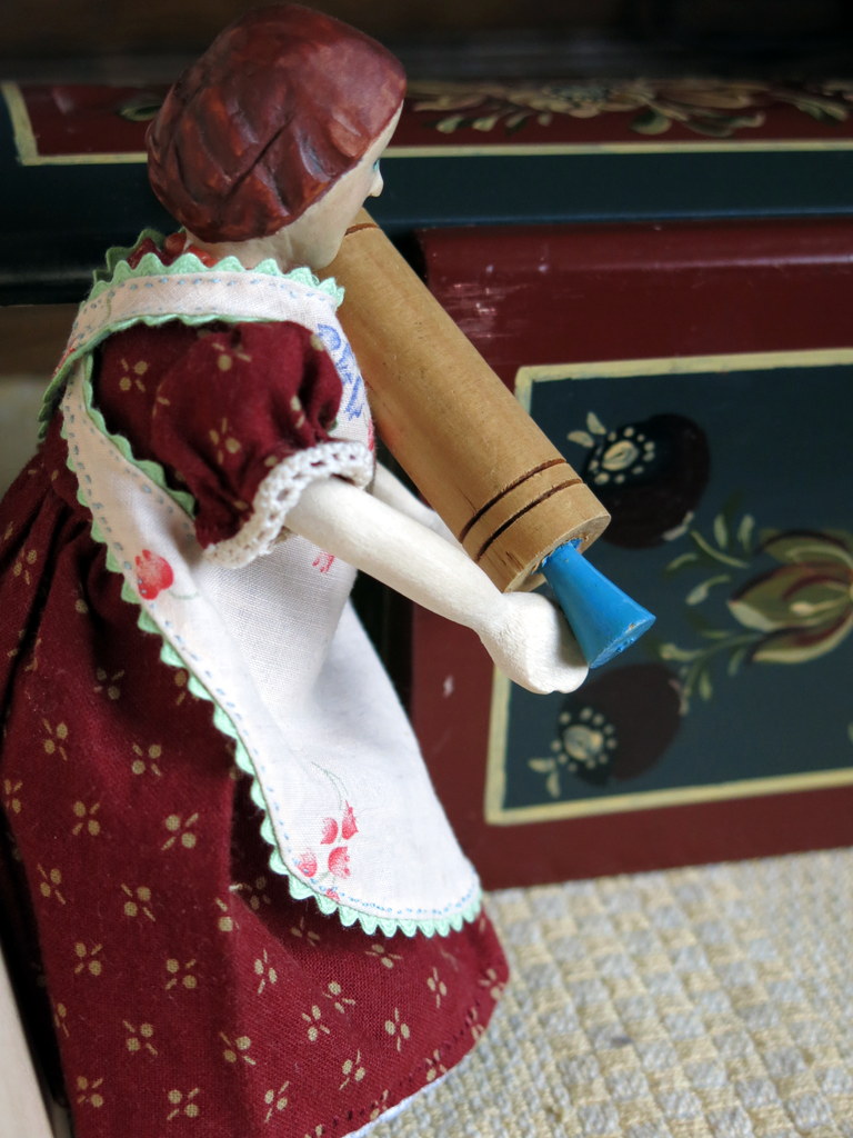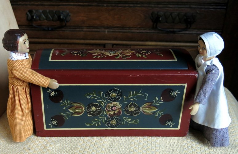 We found a beautiful box; the Quimper Hittys love the hand-painting rosemåling on it! Constance thought it would be a good size to preserve special Hitty things…