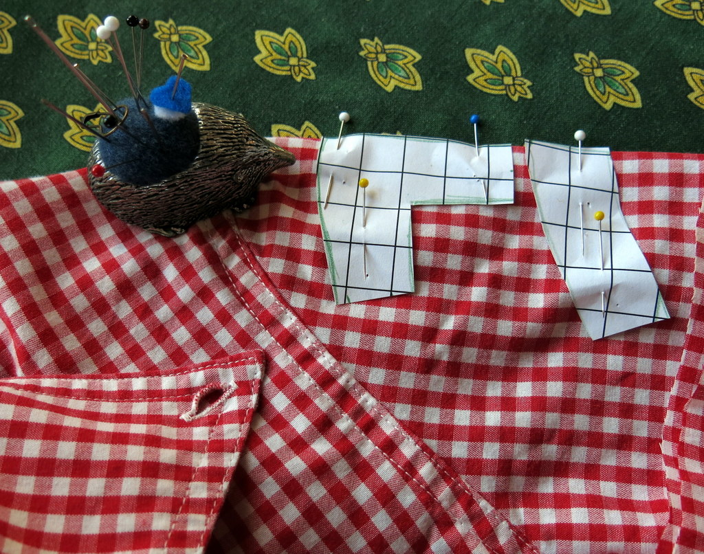 Find some gingham – I cut up a (worn out) shirt! The pattern pieces are made on squared paper where the squares are half an inch (1.2 cm) a side. Place pieces on a fold and cut two of each. Sew with 1/8 inch seam.