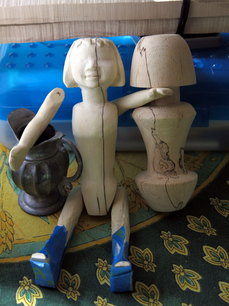 A Spalted Chestnut Hitty blank, after languishing in the carving basket for months, is finally on the way to becoming a doll…