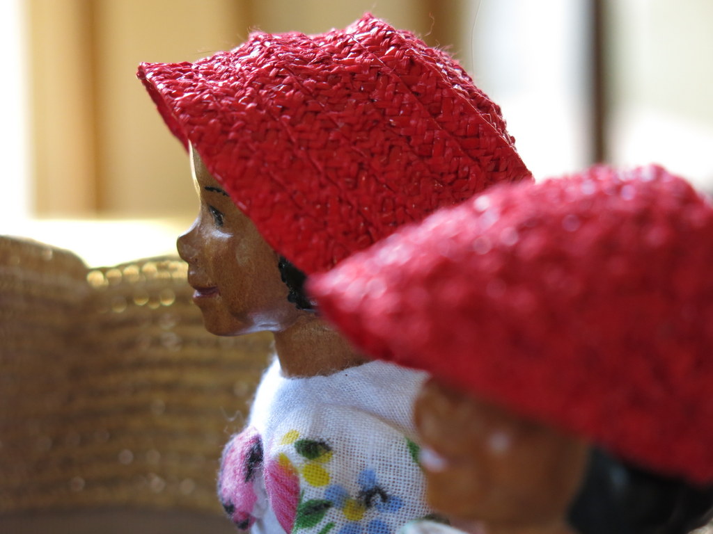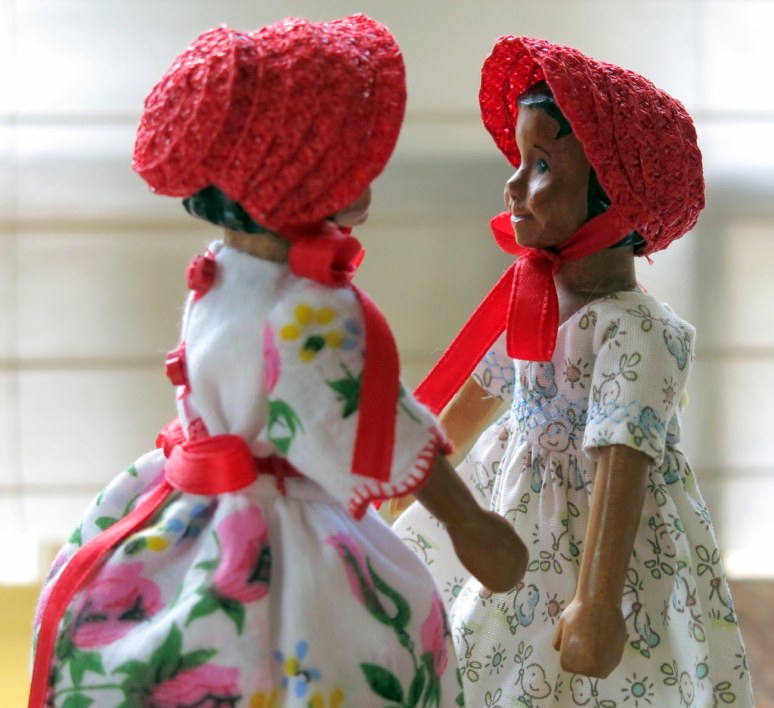 After all the millinery in the Quimper Hitty cupboard, the block twins claimed the red straw bonnets.