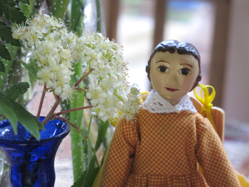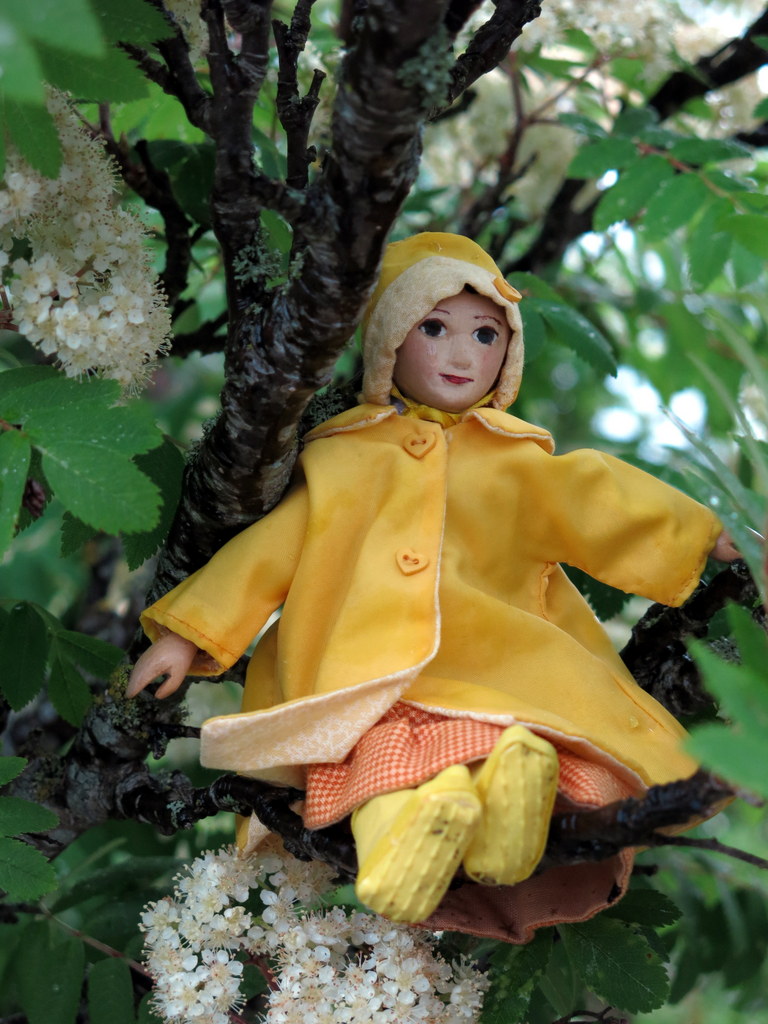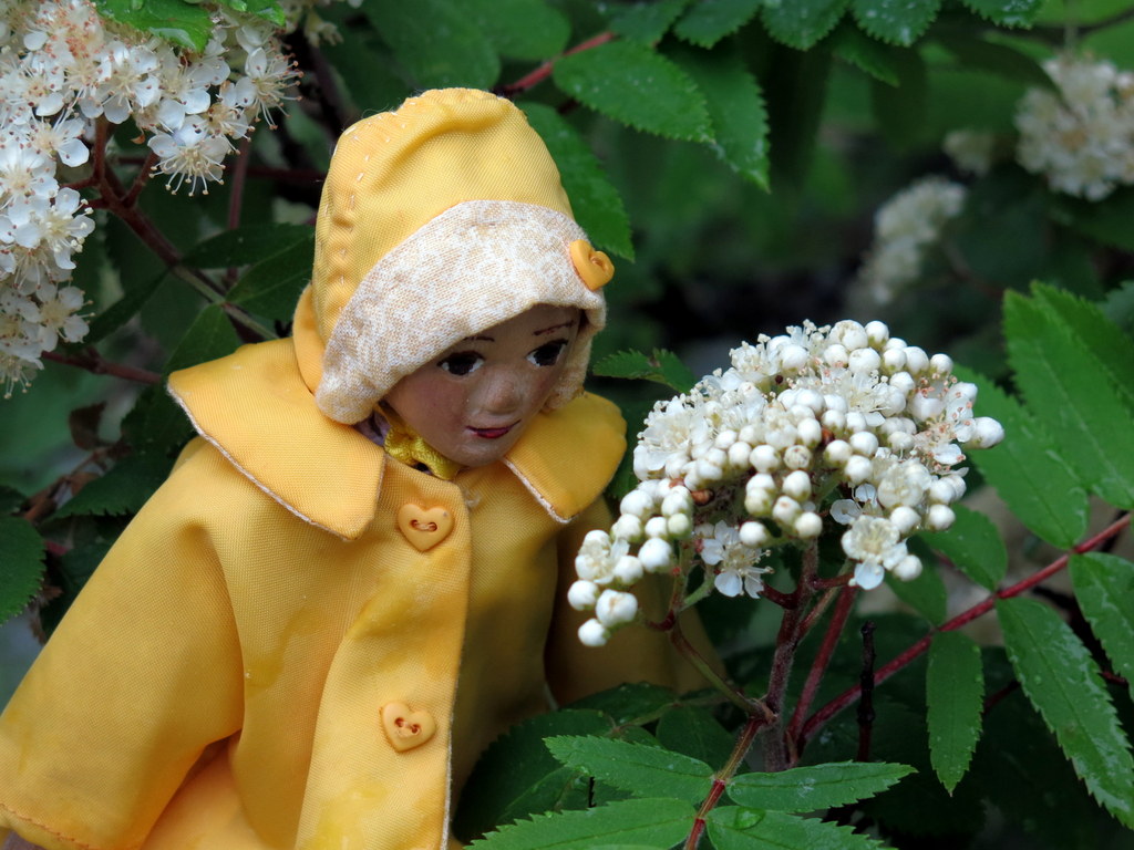 2. As always Constance is a gift . Her rain coat, hat and boots are so attractive. The Mountain Ash blossoms are lovely.