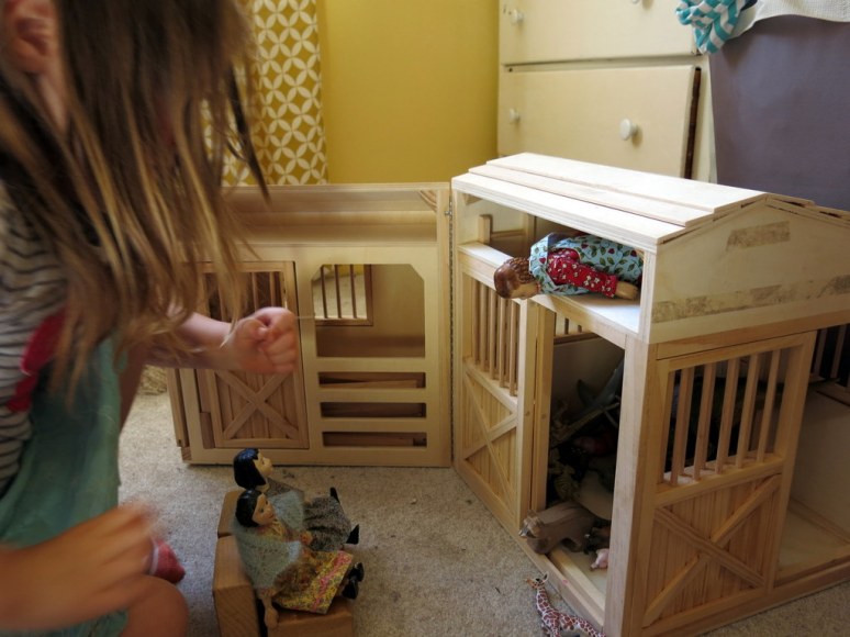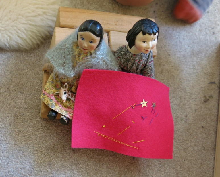 That Hitty sized barn is brilliant. Who carved and painted those critters. The racoon and baby deer were just so sweet…but the best part of all was the delighted expression on the youngest human’s face. She is Oh so adorable. The blanket she made with shooting stars and planets (the buttons) was so creative. I think I know where she gets that from. Thank You for sharing this with us. It will keep me smiling all day.