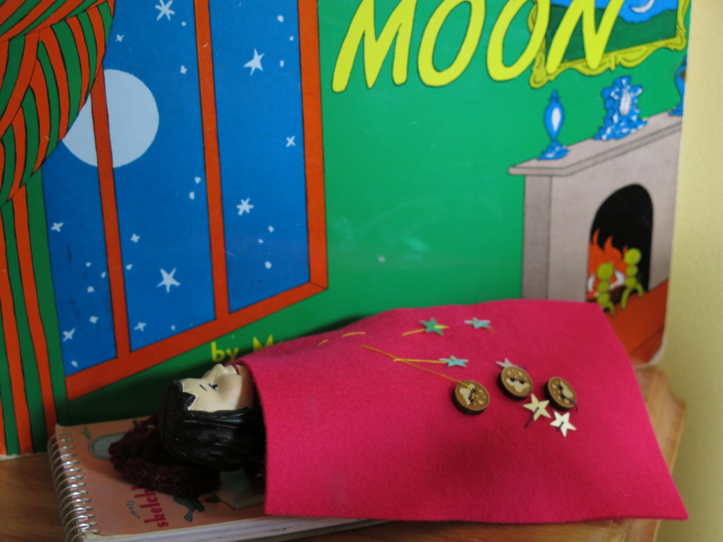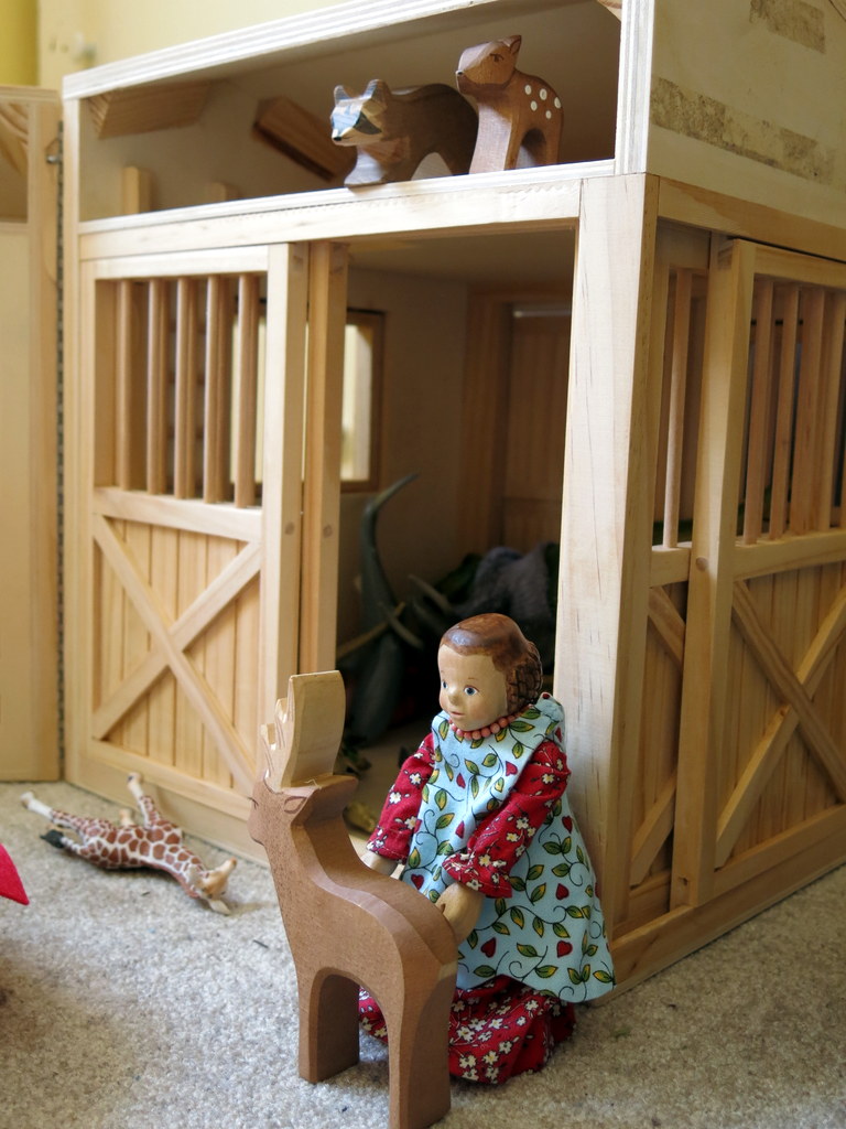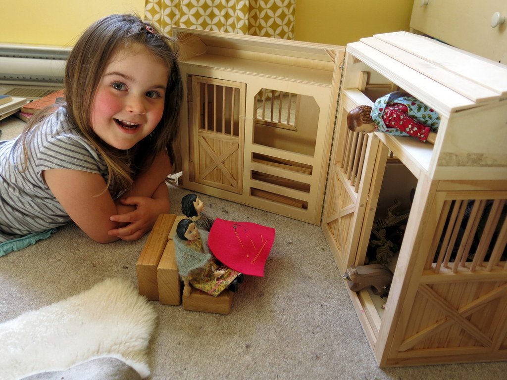 That Hitty sized barn is brilliant. Who carved and painted those critters. The racoon and baby deer were just so sweet…but the best part of all was the delighted expression on the youngest human’s face. She is Oh so adorable. The blanket she made with shooting stars and planets (the buttons) was so creative. I think I know where she gets that from. Thank You for sharing this with us. It will keep me smiling all day.