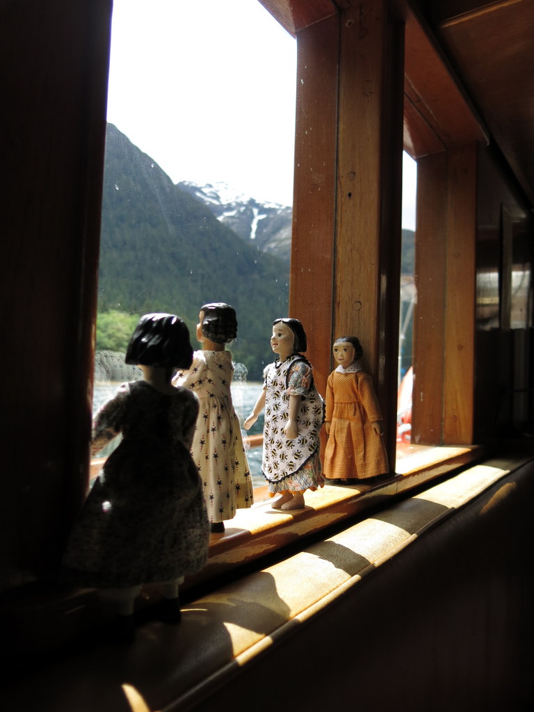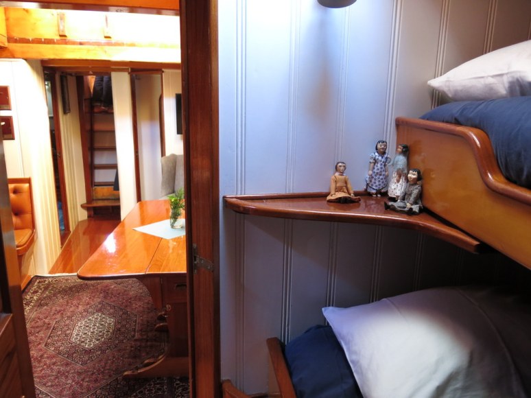 We got a tour of the boat, including the galley, wheelhouse, lounge/dining area/library, and the Head…then were shown to our bunks. Ours was the port side forward cabin, with down quilts, lovely pillows, our own sink, neat drawers and a convenient Hitty shelf!