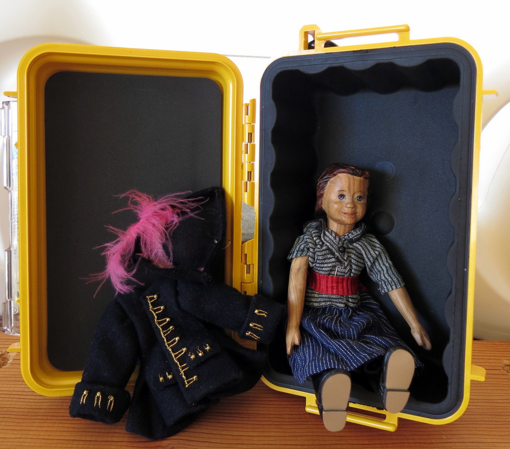 It was hard to choose which Hittys to bring on this Expedition. The Quimper Hitty human brought the first Hitty she ever carved (Constance) and the most recent-but-one (Tephra) as company on the Passing Cloud. Florence and Prim also came, as they were making a one-way trip. However when the luggage was unpacked, we found a stowaway!