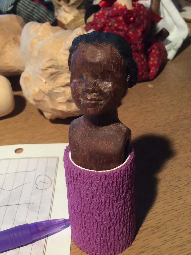 I am so incredibly lucky, and grateful! Janet helped by describing, illustrating, encouraging, removing big chunks of wood when my hands ached, and little ones when I needed to refine a concept.  She helped me understand shapes and planes, advised on details, and helped me find the face of a little brown girl in the wood.