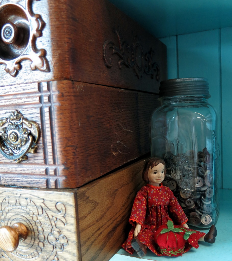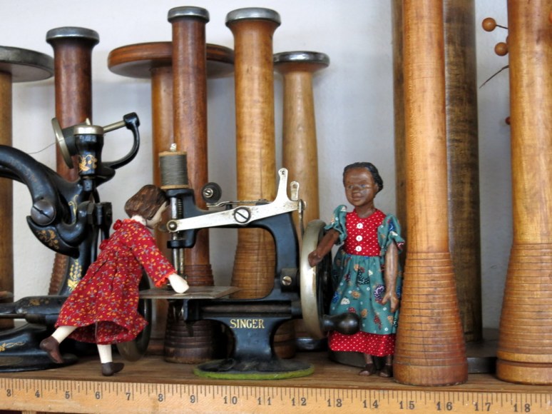 …and up on the very top shelf, giant wood bobbins, and tiny sewing machines – one of them a Singer # 20, exactly like ours!
