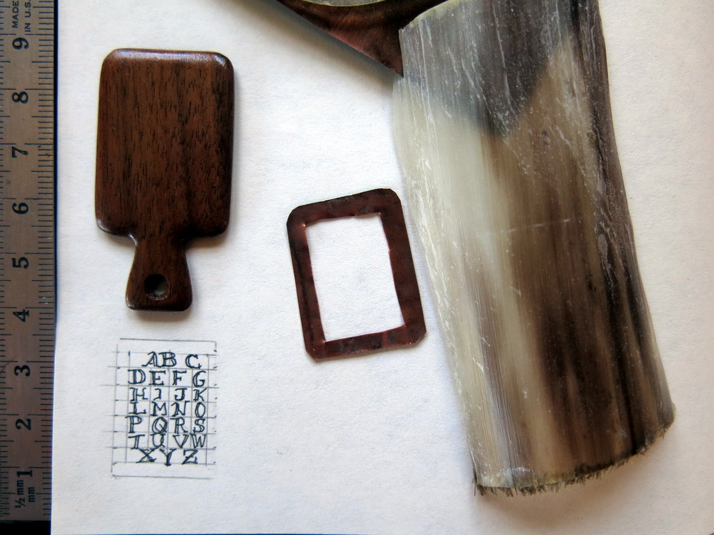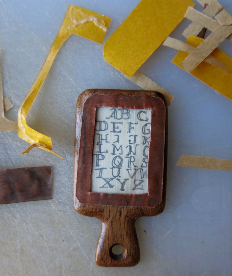 I wrote a tiny alphabet, erased the pencil guidelines, then attached it to the copper and cow horn frame…