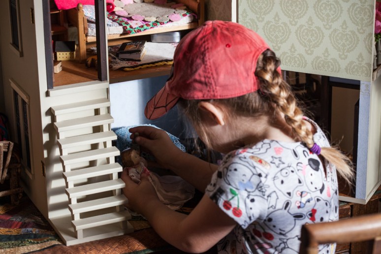 The pretty little fairy likes to walk up the steps even though she could fly if she wanted to.