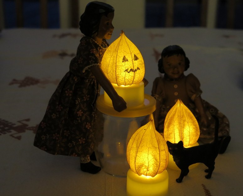 We got the idea from Bjorkasa, and slightly altered it – the Hitty cupboard finds these lanterns less messy than pumpkins!