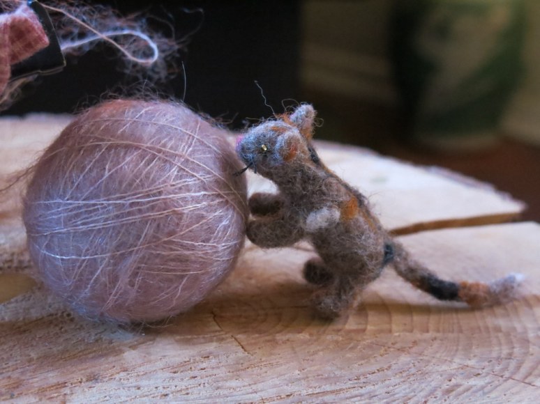 • The yarn reminds me of the pink Silk Halo yarn I got in Sutton Quebec! I like the critters too – the little cat is fun to have around, and always seems to show up when there are balls of yarn around!