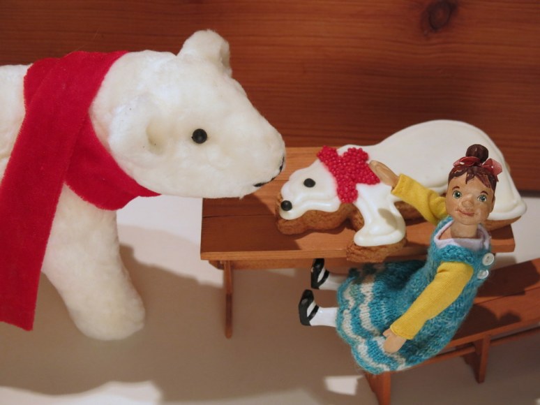 2. what a funny ending to your story!! That polar bear cookie is amazing…so wise of Min to decide to share! The girls looked lovely on their outing. I imagine the relative was pleased to see such pretty little visitors.