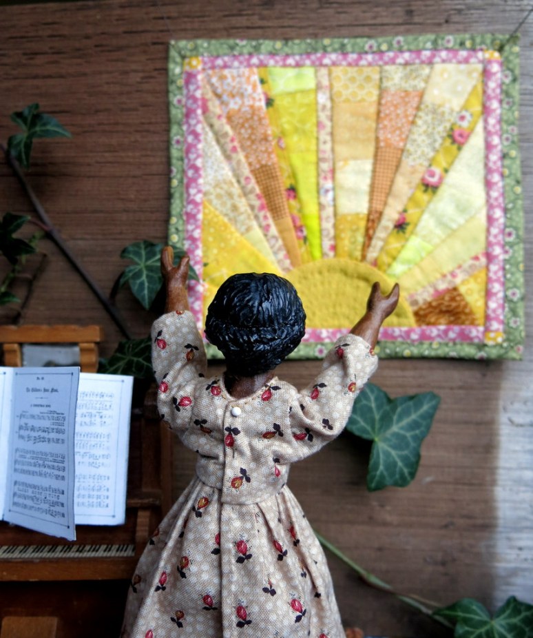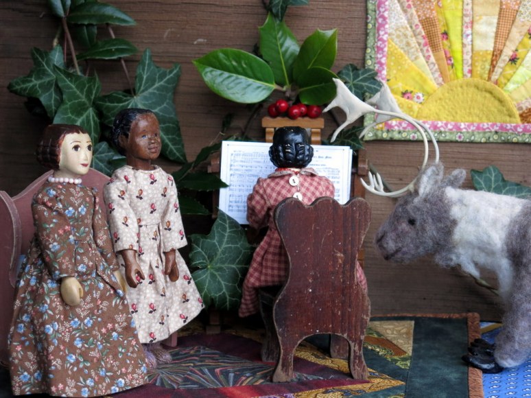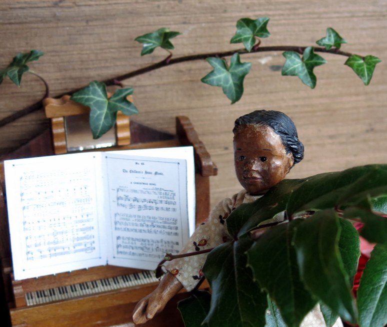 A lovely way to brighten the day for all of us…love the wall hanging and the holly and the piano AND the wonderful Hitty girls. also like that friendly reindeer.