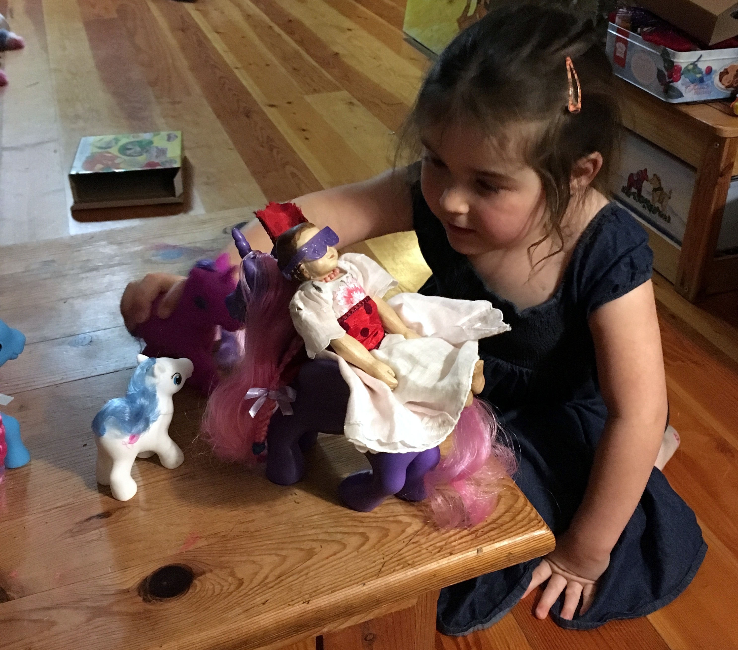 …but in fact, she is working hard to help her little girl tame the new Unicorn and Pony herd!