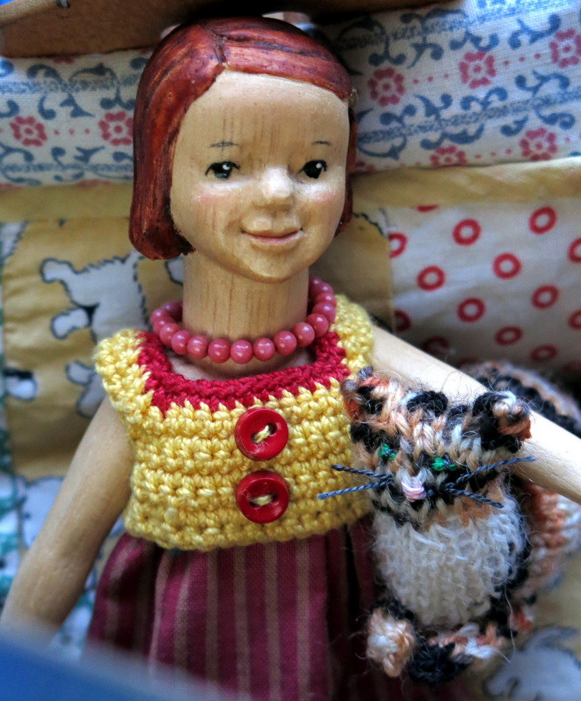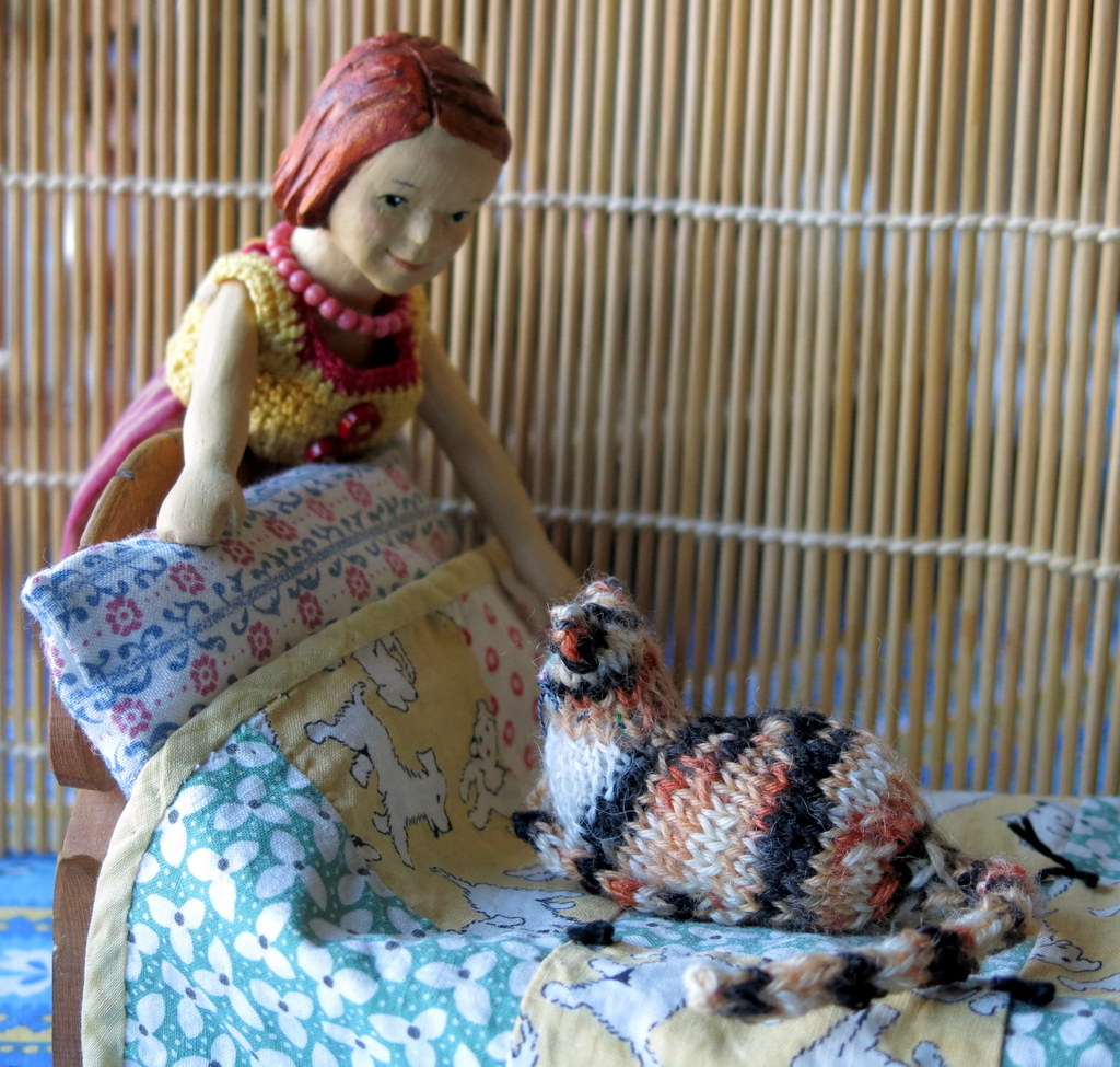 This is the Tiny Parlor Cat – a free pattern by Sara Elizabeth Kellner, downloadable from Ravelry. Click here for a link to the pattern, adjusted as per our Hitty friend Crazy Quilter’s suggestions of using fingering weight yarn and size 2 mm (US 0) needles.
