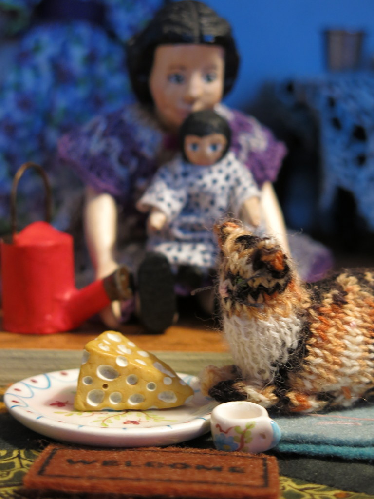 • Yes, the Quimper Hittys do like cats that go to parties, eat delicious cheese, allow themselves to be petted, and are tolerant of baths. It was very nice calico yarn – I think there is enough left to make a couple more cats. The block twins want cats too!